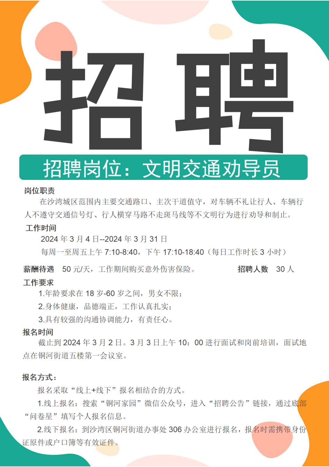 为进一步加强文明城市创建工作,引导广大居民朋友遵守交通规则,根据工作需要现计划向社会公开招聘文明交通劝导员30人。期待您的踊跃参与!