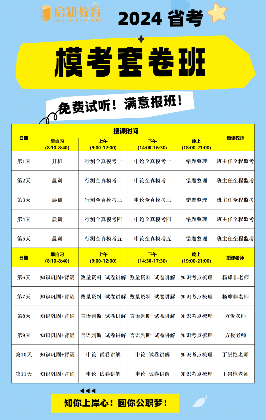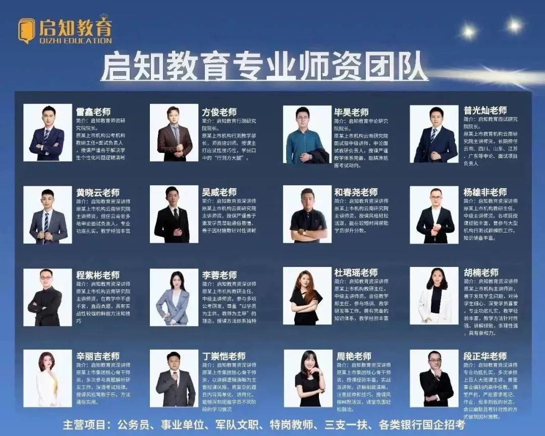 启知师资团队,专注云南6年以上,行业经验深,授课经验丰富。团队成员善于分析、研究云南考官评判标准,善于分析学员实际,为学员制定个性化训练方案。