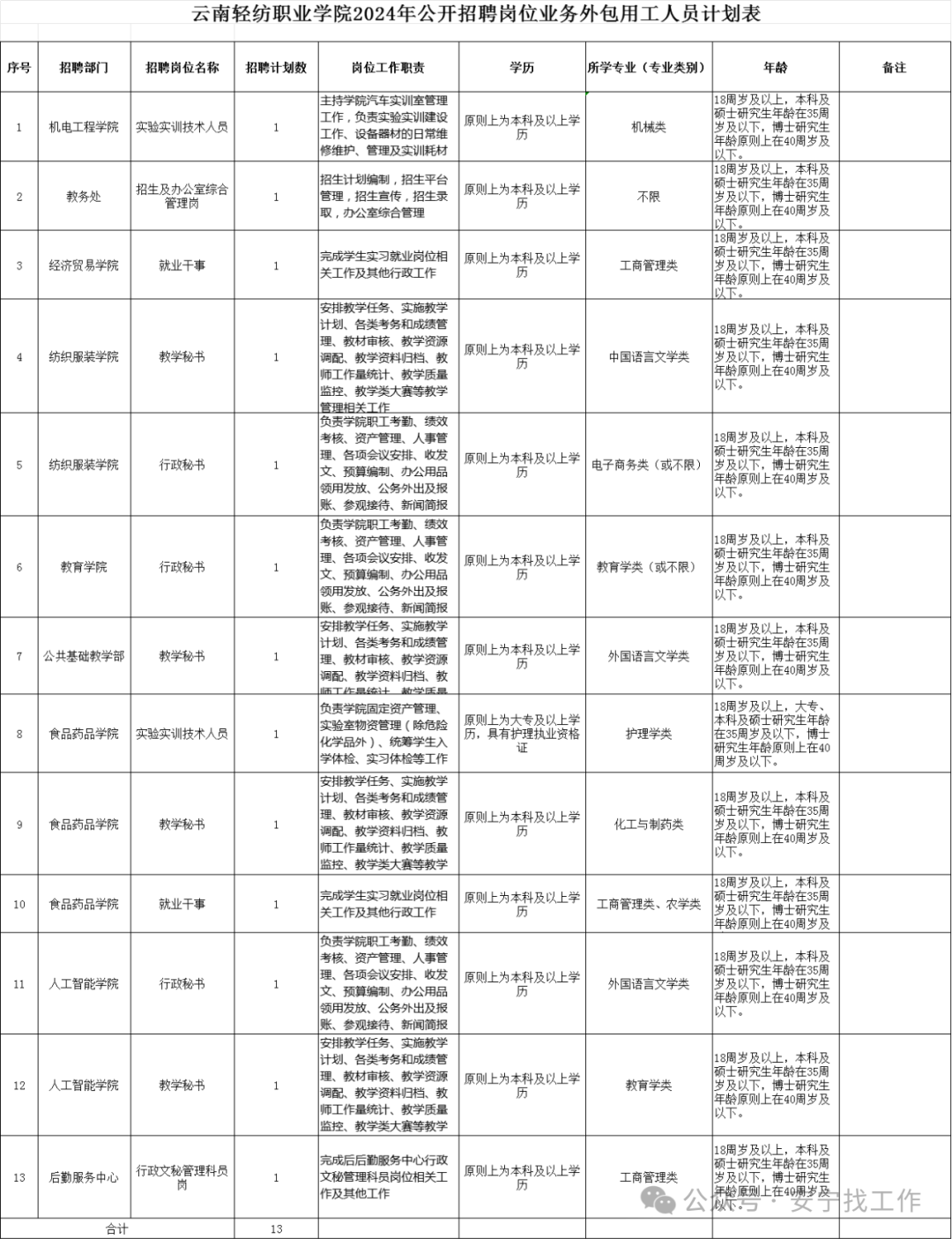 >【安宁招聘】云南轻纺职业学院招聘13名岗位业务外包人员!地点安宁
