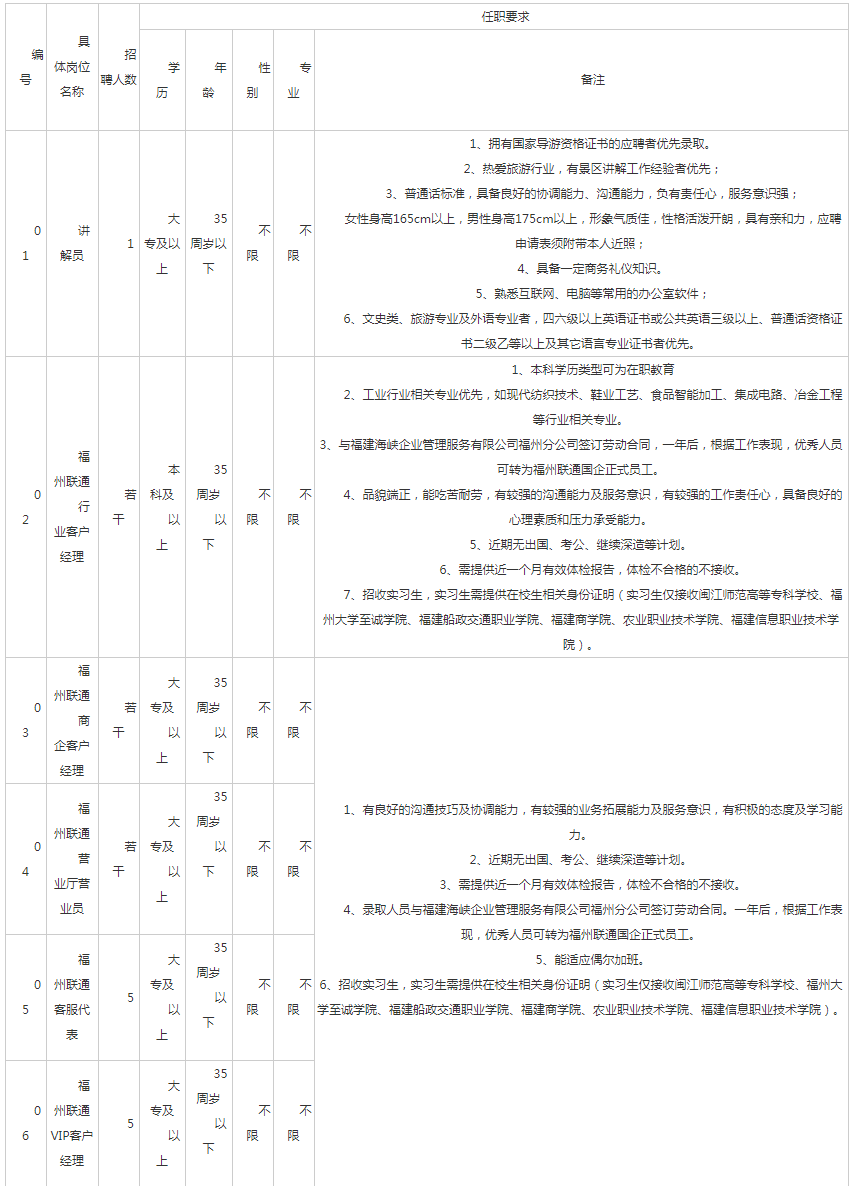 04营业厅营业员:可结合意愿就近安排福州联通营业厅;营业厅内客户服务与业务受理;营业厅内各类联通产品销售;各类营销、促销工作的参与。