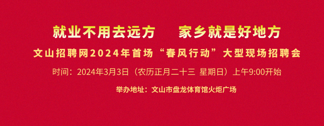 2024年3月3日,文山招聘网特举办:“就业不用去远方·家乡就是好地方”的2024年文山招聘网首场“春风行动”大型现场招聘会,不管你是找工作还是招揽人才,这场人才盛宴不可错过!诚邀广大企业和求职者的参加: