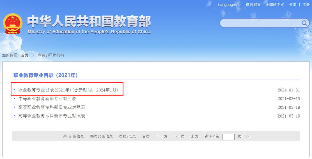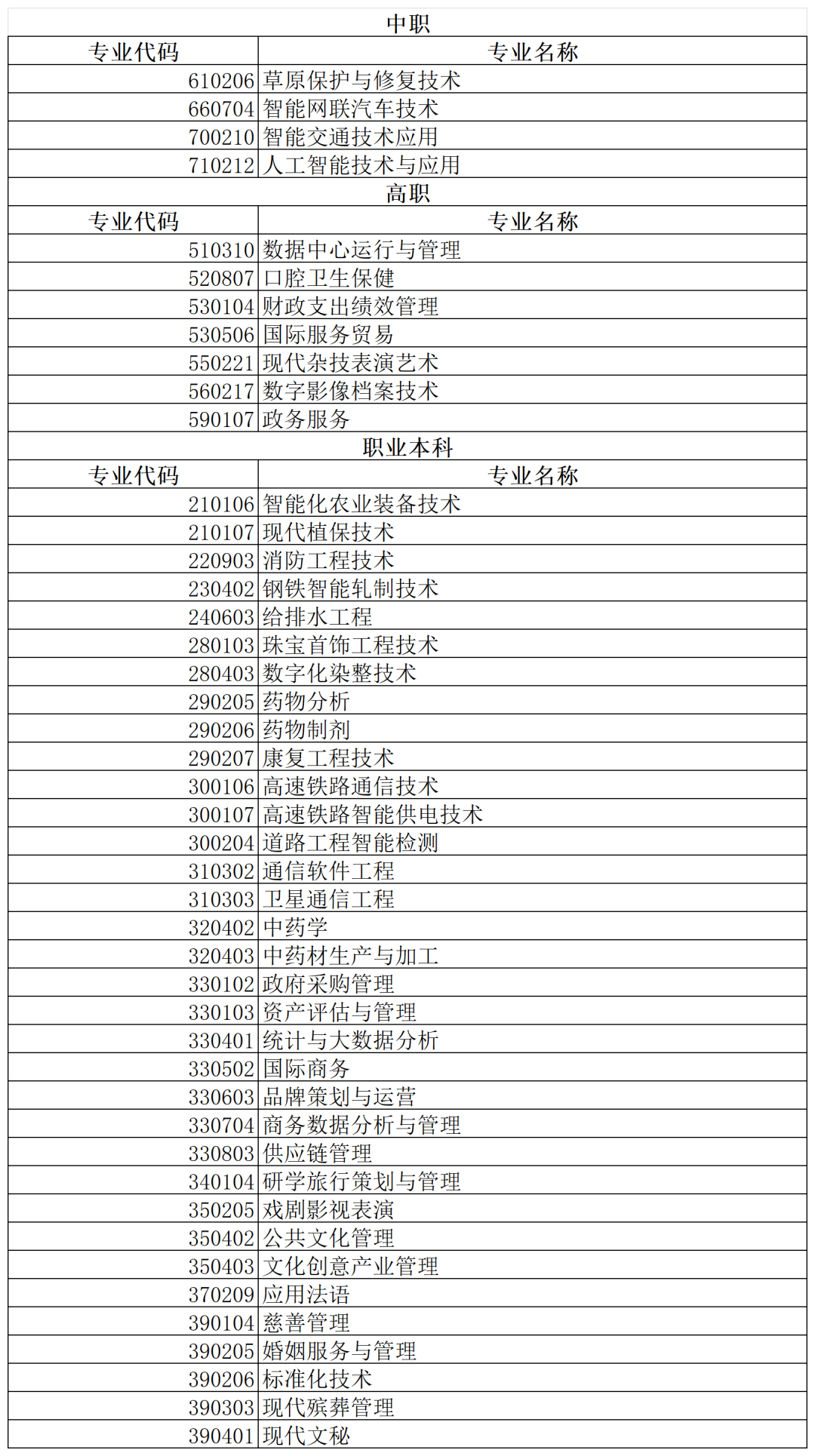 近日,教育部官网发布了最新的《职业教育专业目录(2021年)(更新时间:2024年1月)》。其中,中职专业新增4个,高职专业新增7个,职业本科专业新增34个。具体内容如下: