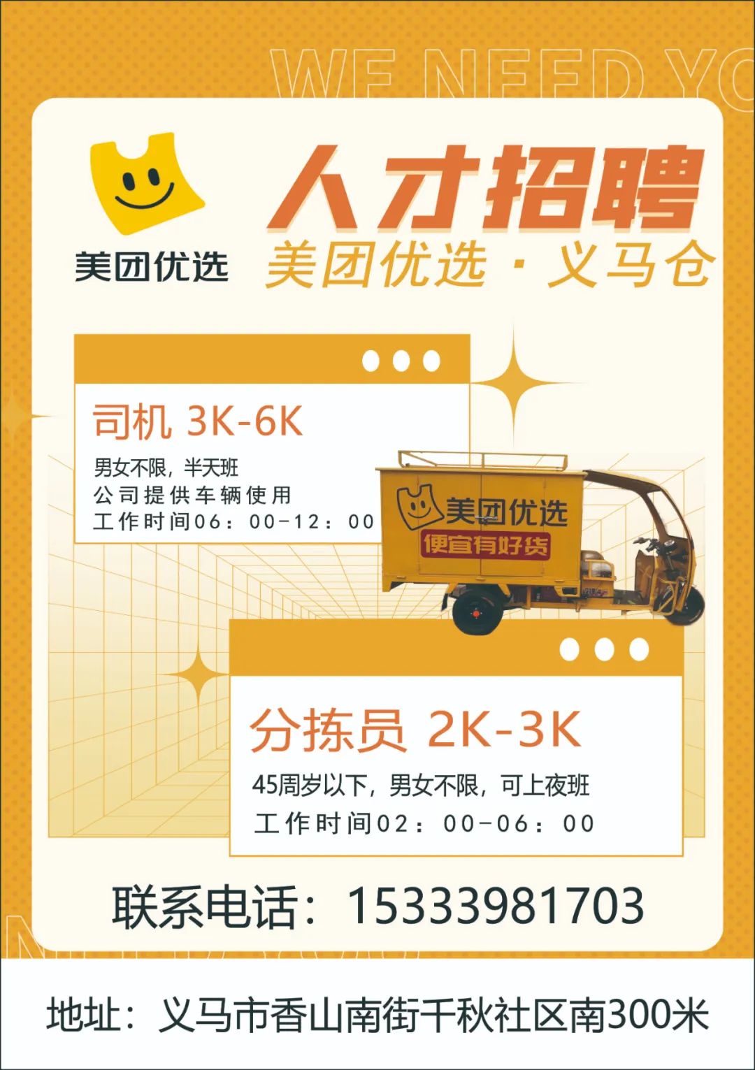 义马美团优选:招聘司机,面包车三轮车均可,月薪三千到六千;招聘分拣,月薪两千到三千夜班。
