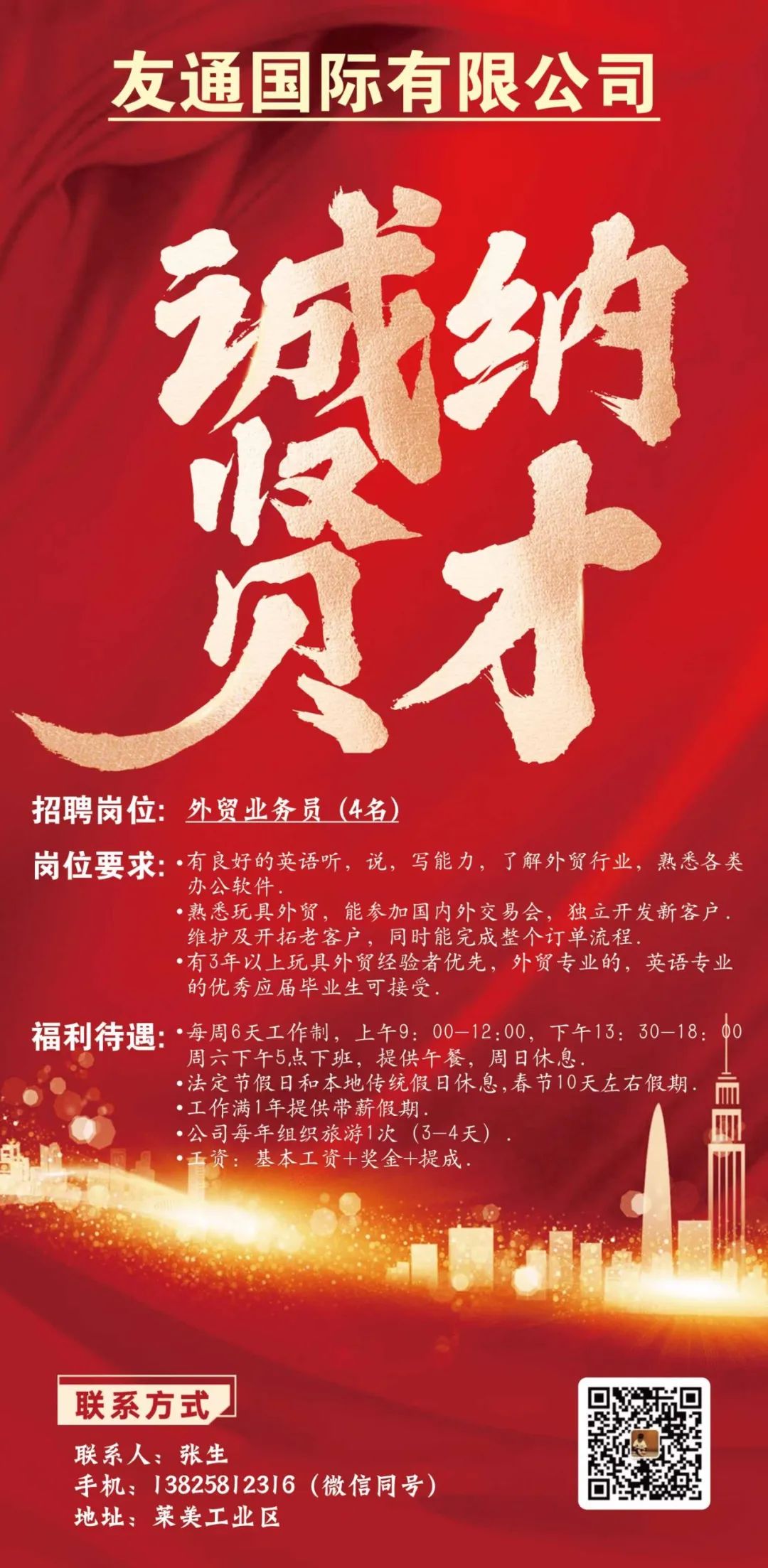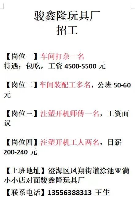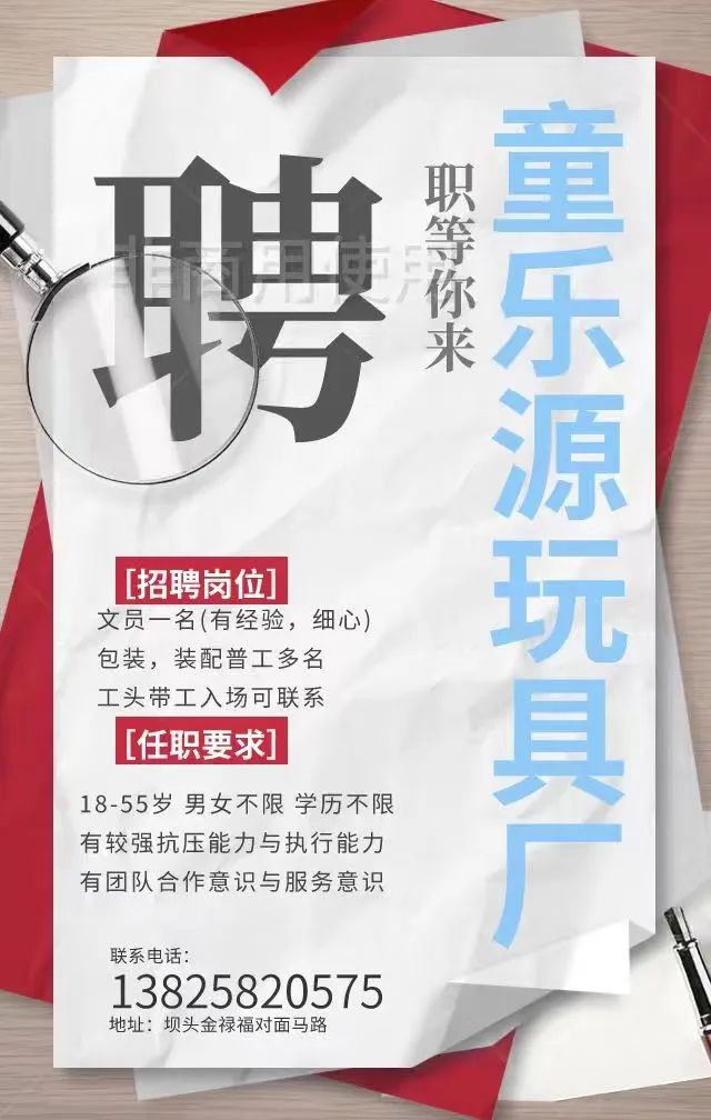 【要求】年龄30-50周岁,有三年以上玩具厂经验;工资待遇面谈。