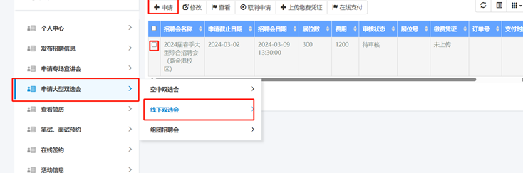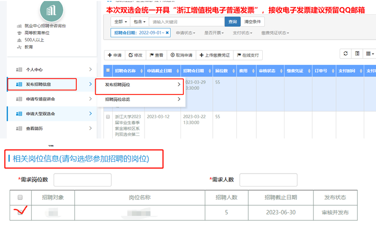 双选会将为用人单位搭设标准展位(2米*1米),一桌两椅,门楣标示参会单位名称,参会费用1200元/展位(含场地费、展位费、会议资料、饮用水等)。报名参会申请通过的用人单位,请在收到短信后截止时间前完成在线付款(确认展位审核通过后付款),逾期则视为自动放弃参会,交费详情见:交费须知.doc。