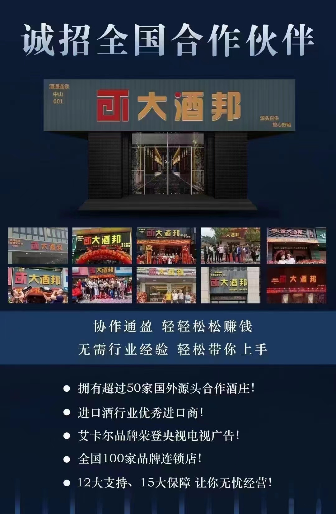 大酒邦是一家以进口酒类贸易分销代理为主,集连锁店销售管理、进出口清关、专业葡萄酒培训一体的集团性供应链酒商。公司专注于酒类行业10余年,秉承"源头直供放心好酒"的经营理念,为消费者甄选全球精品/真品/源头/价优美酒。集团拥有3家全资子公司,100人专业服务团队,拥有超五十家国外源头合作酒庄,上百个独家自主品牌,涵盖葡萄酒、白兰地、威士忌、清酒、白酒等多个品类,5000个国内经销网点,全国100家品牌连锁店,市场覆盖全国30多个省、自治区和直辖市。酒通集团作为进口红酒洋酒领跑者,已然成为葡萄酒文化的普及者和葡萄酒市场的规范者。