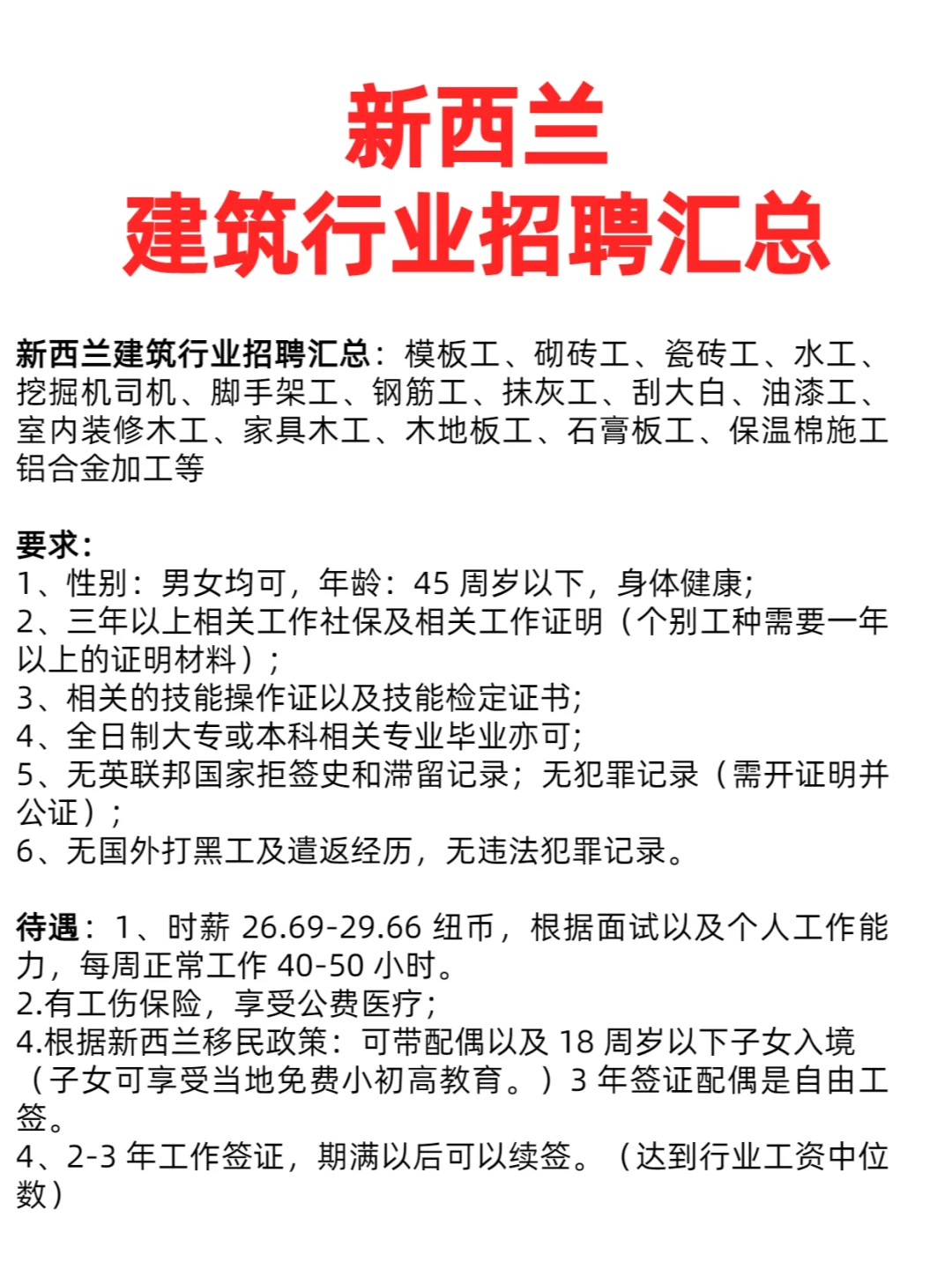 新西兰建筑行业招聘汇总,有手艺看过来!