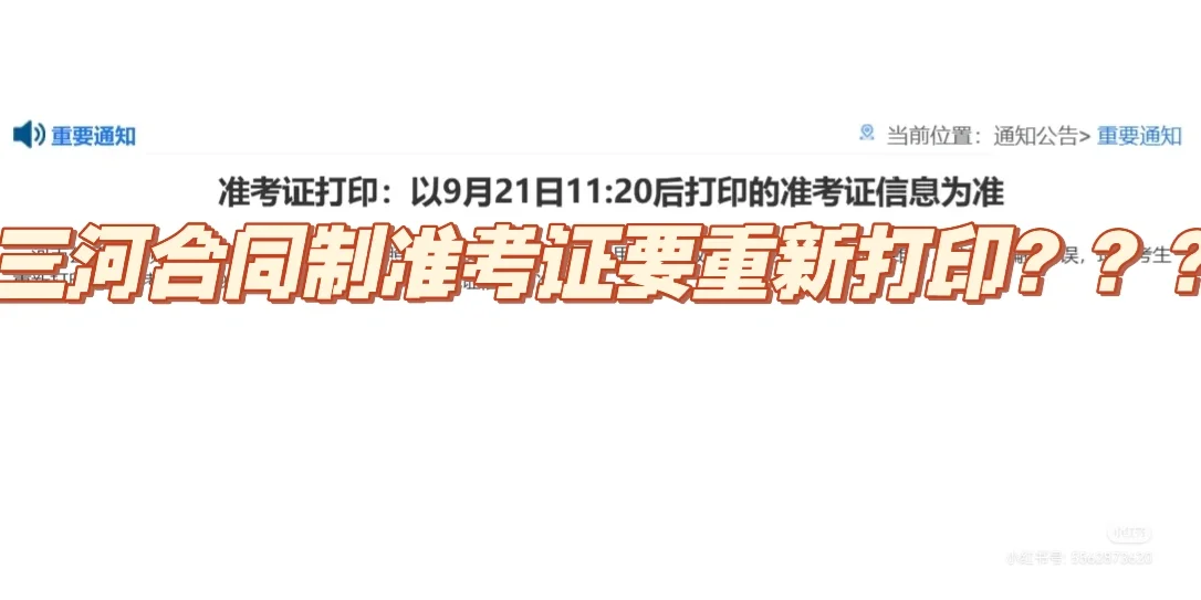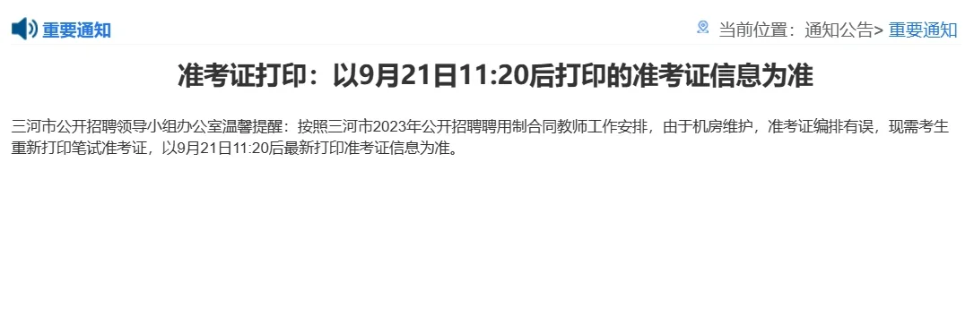 按照三河市2023年公开招聘聘用制合同教师工作安排,由于机房维护,准考证编排有误,现需考生重新打印笔试准考证,以9月21日11:20后最新打印准考证信息为准。