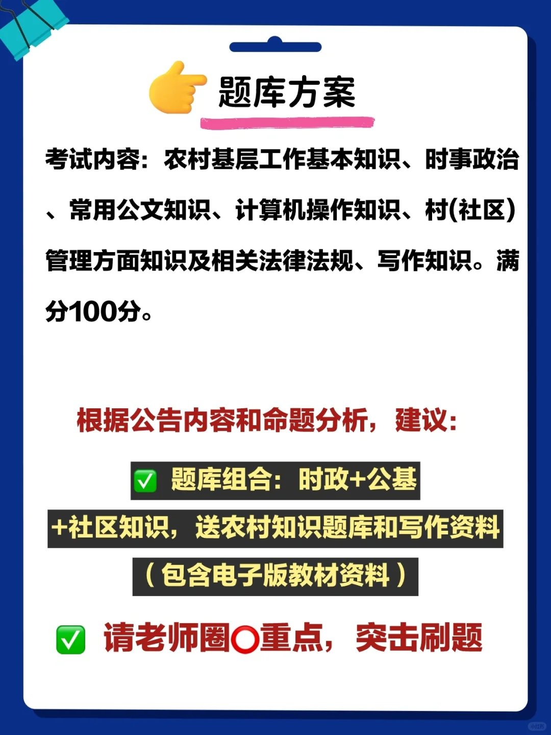 ✅题库方案:时政+公基+社区知识,送农村知识题库和写作资料