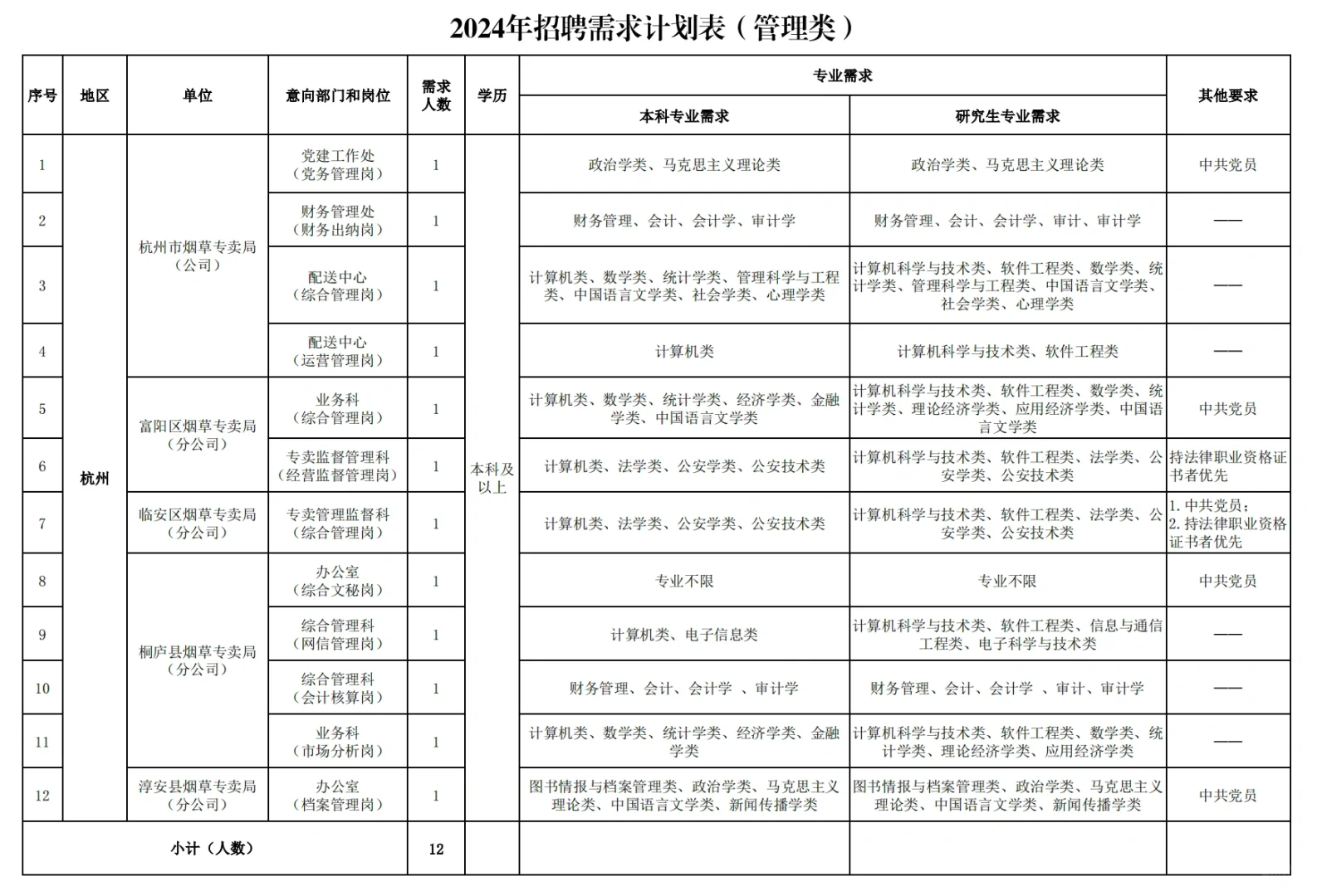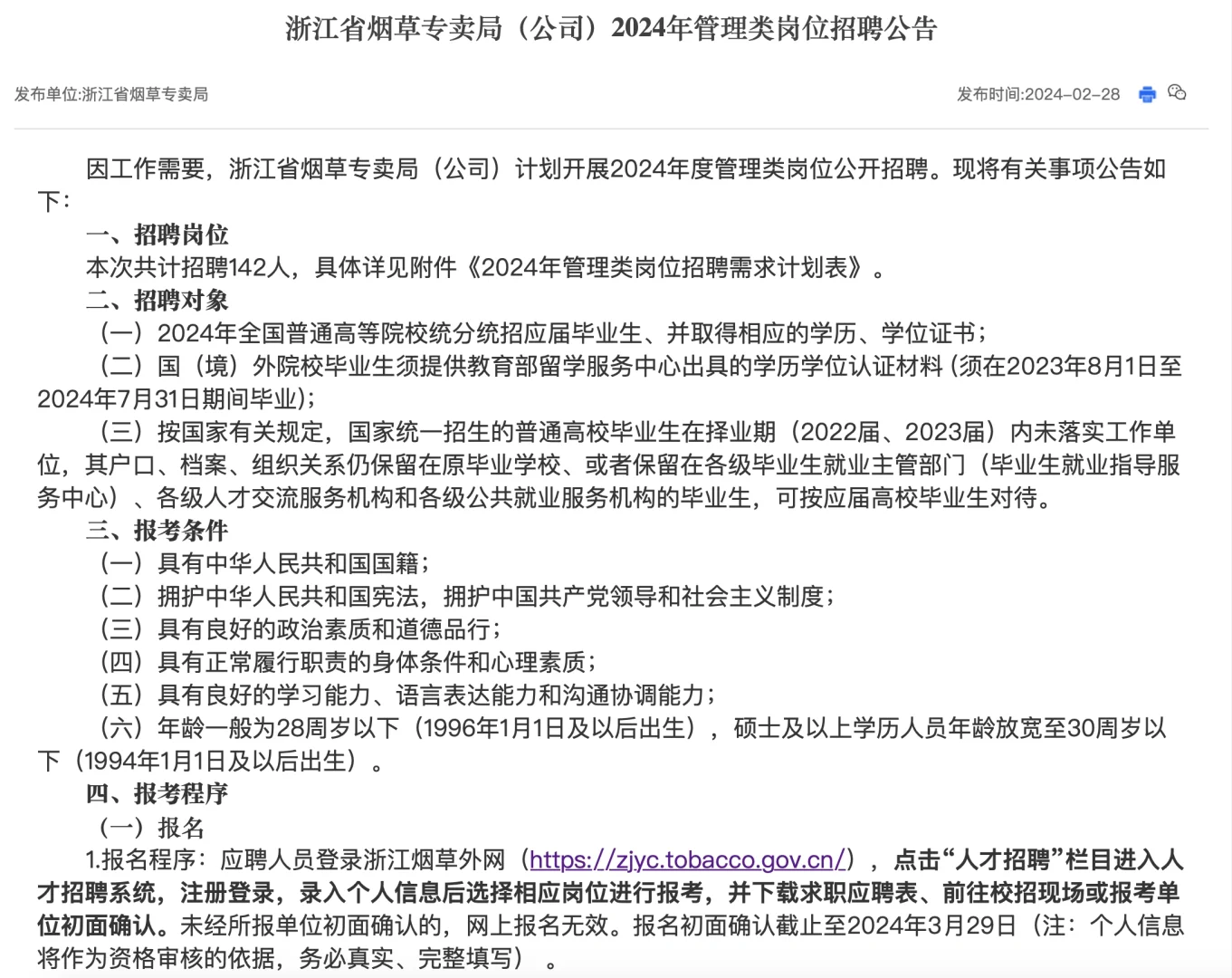 2024浙江烟草专卖局管理类岗招聘142人❗