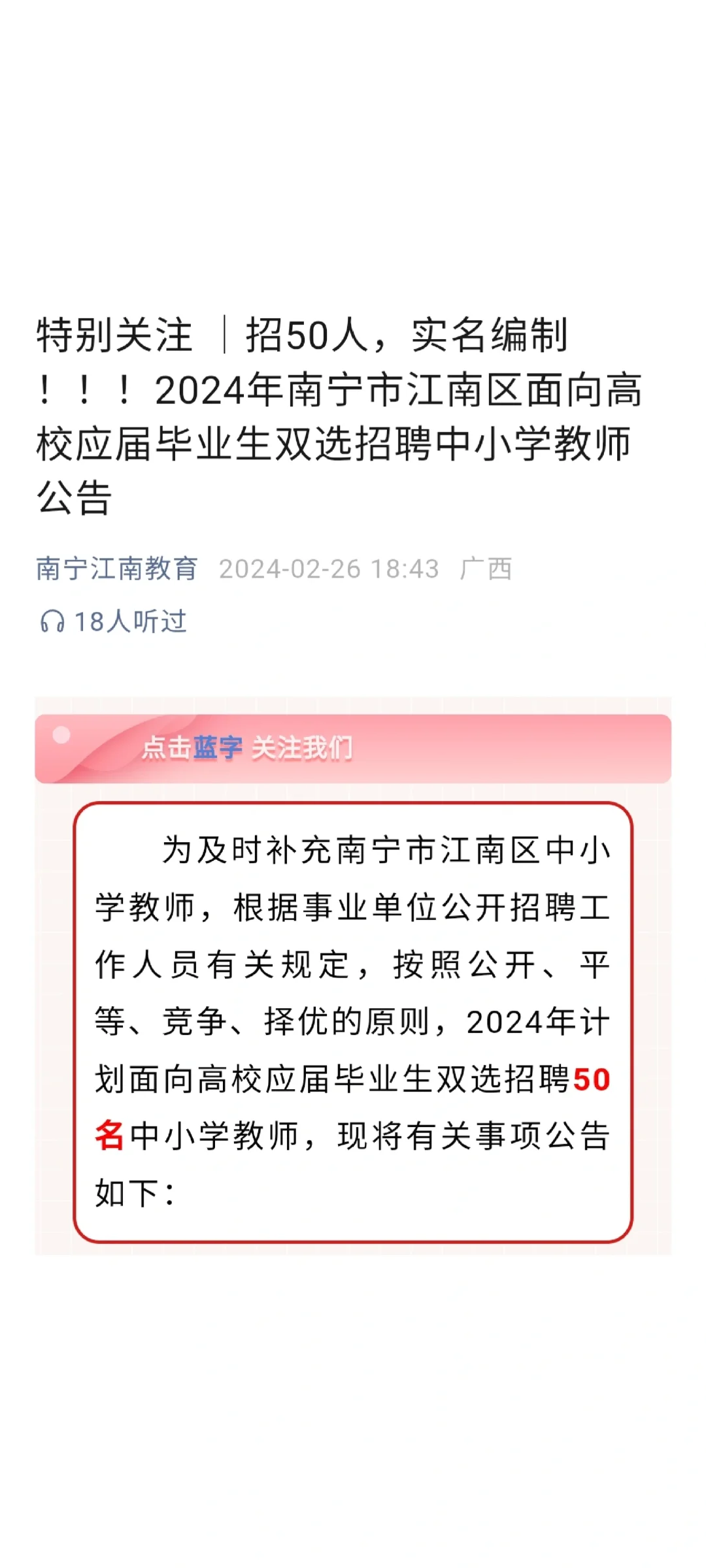特别关注 |招50人,实名编制 !!!2024年南宁市江南区面向高校应届毕业生双选招聘中小学教师公告