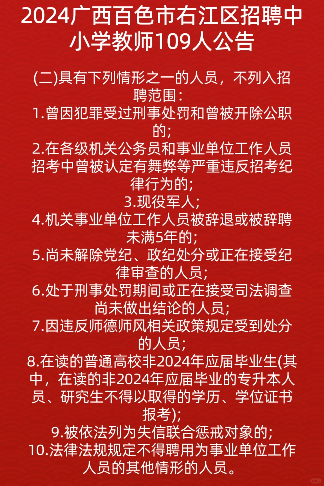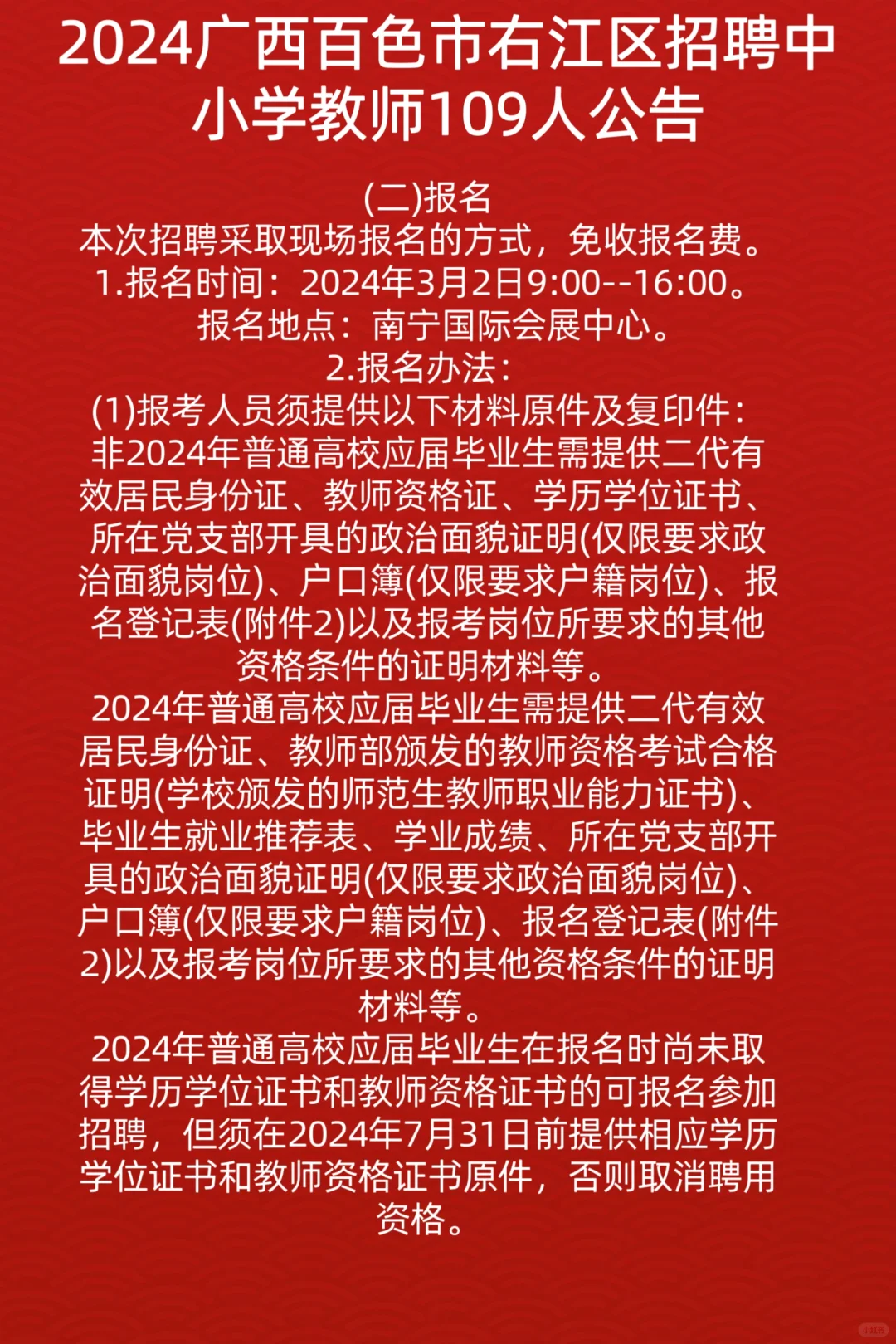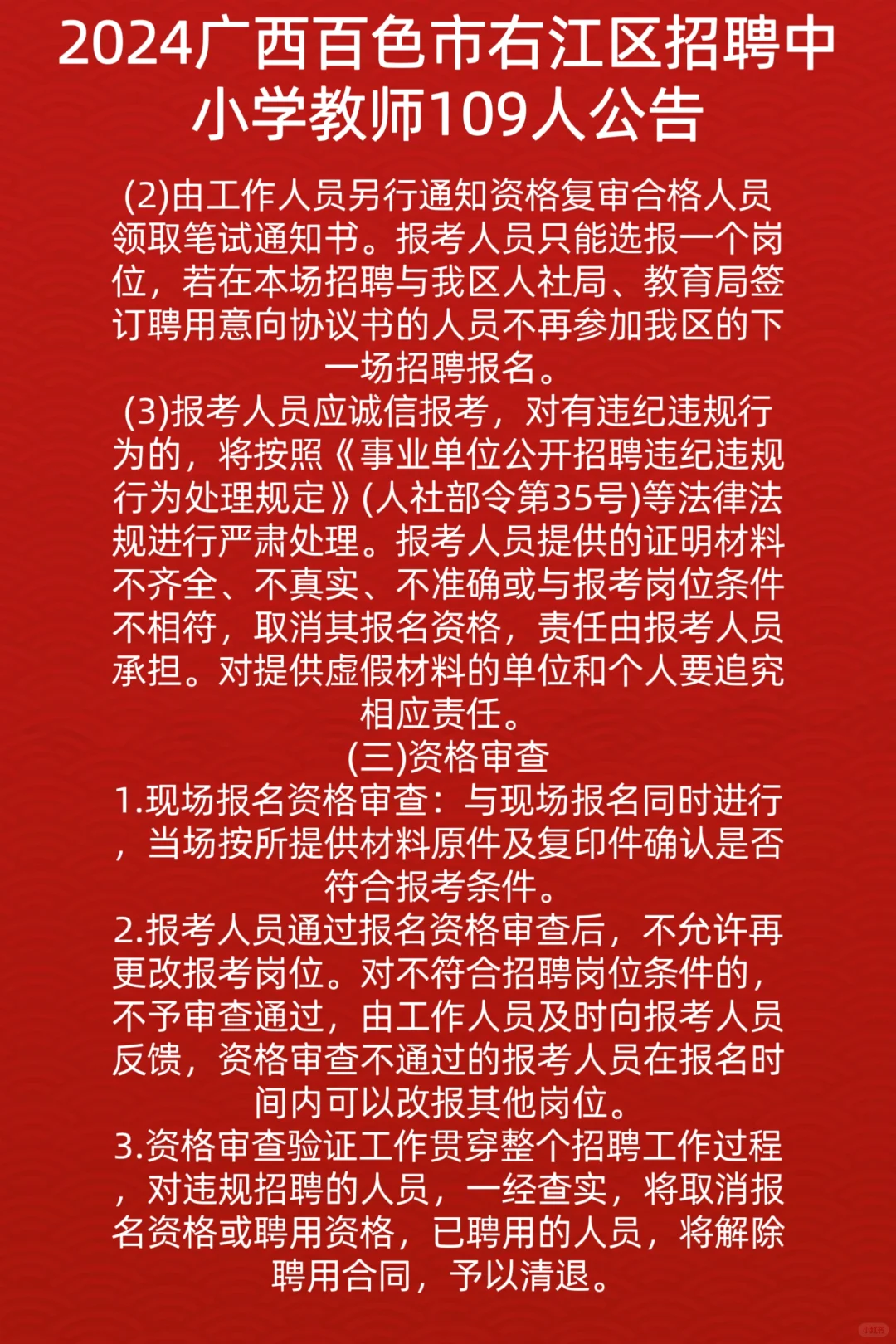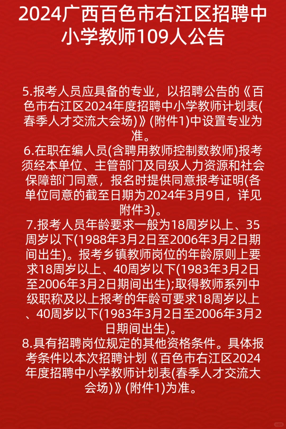 百色市右江区24年招聘中小学教师109人~ [爆炸R]出啦!招109人! [爆炸R]2024百色右江区招聘中小学教师 [爆炸R]报名时间:2024年3月2日9:00—16:00 [爆炸R]笔试时间:2024年3月23日 [爆炸R]面试时间:2024年3月31日 #中小学教师 #编制 #高校教师招聘考试 #教育 #教师招聘面试 #高校教师备考 #教师编 #广西教师 #中公教育 #初中教师 #小学教师 #教育学 #心理学 #教学教法 #百色招聘 #教师招聘 #教师招聘备考 #教师招聘考试 #教师 #教师编 #幼儿园 #高中 #在编教师 #语文 #数学 #地理 #历史 #生物 #英语 #音乐 #教师编制 #2024教师招聘 #2024百色教师招聘 #广西教师编 |