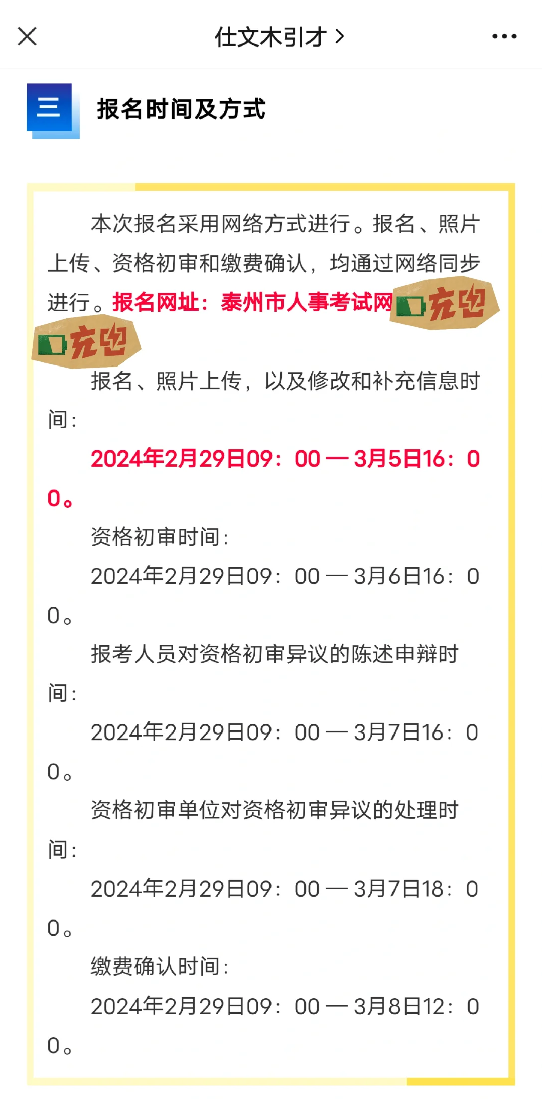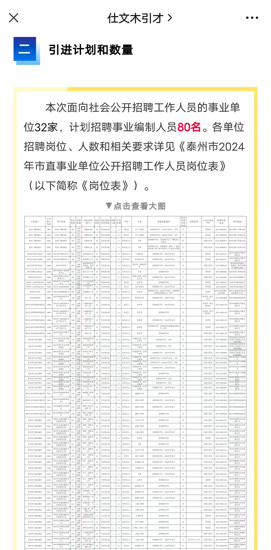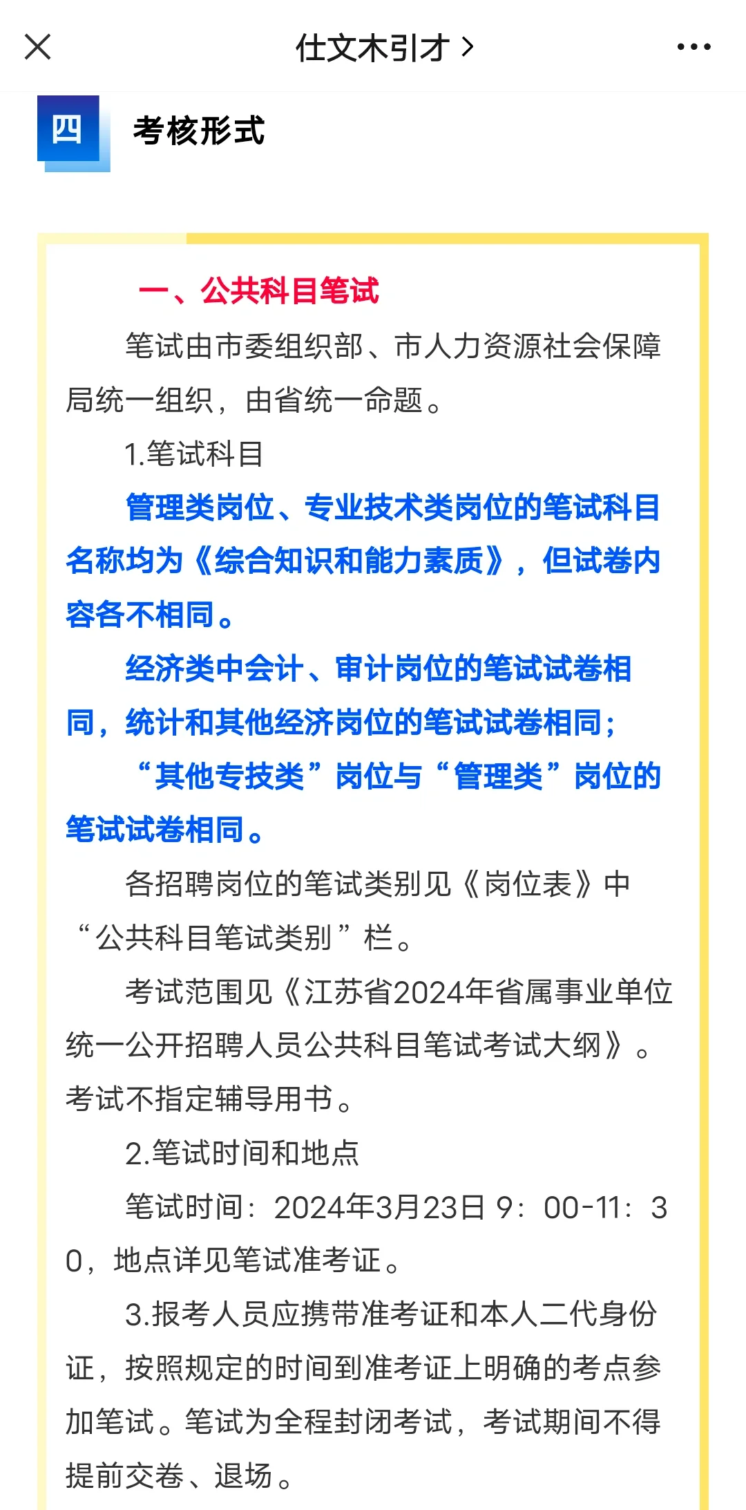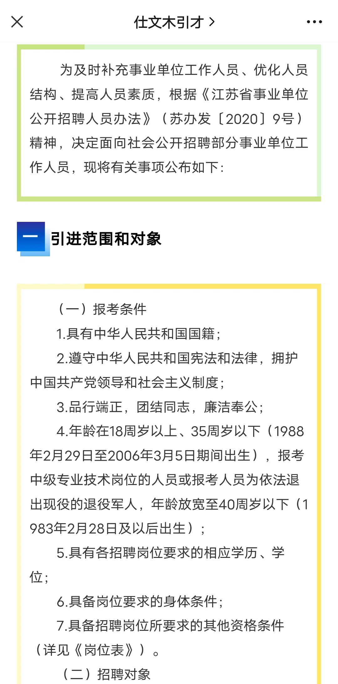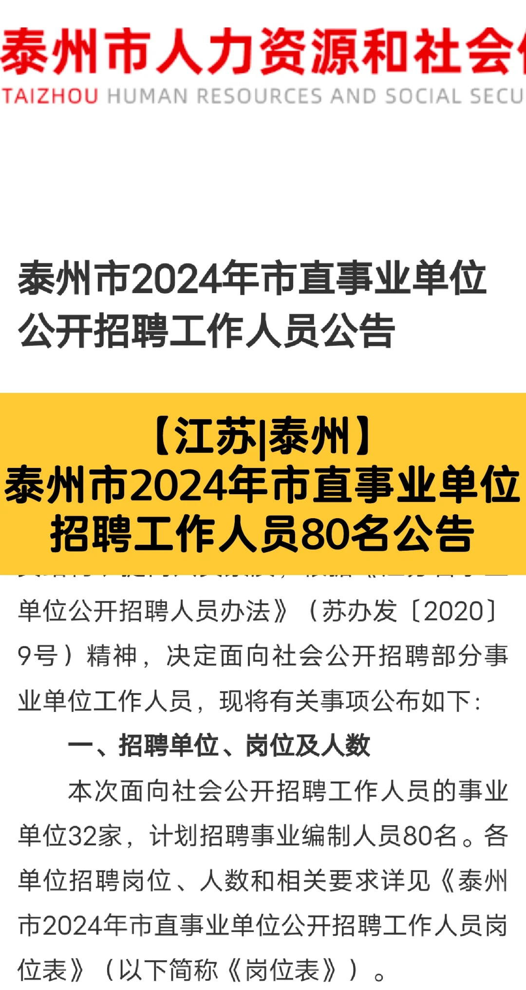 泰州市2024年市直事业单位招聘工作人员公告 [一R]【原文标题】泰州市2024年市直事业单位公开招聘工作人员公告 [二R]【招聘对象】年龄在18周岁以上、35周岁以下(1988年2月29日至2006年3月5日期间出生),报考中级专业技术岗位的人员或报考人员为依法退出现役的退役军人,年龄放宽至40周岁以下(1983年2月28日及以后出生); 具有各招聘岗位要求的相应学历、学位; 具备岗位要求的身体条件; 具备招聘岗位所要求的其他资格条件(详见《岗位表》)。 [三R]【招聘人数】本次面向社会公开招聘工作人员的事业单位32家,计划招聘事业编制人员80名。 [四R]【报名时间】2024年2月29日09:00 — 3月5日16:00。 [五R]【报名方式】采用网络报名的方式进行 [六R]【考核方式】采用公共科目笔试、专业科目加试和面试的方式进行 [七R]【编制待遇】事业编制 #仕文木引才#人才引进指南 #事业编制 #人才引进 #事业编 #事业单位 #工作招聘 #江苏#泰州 |