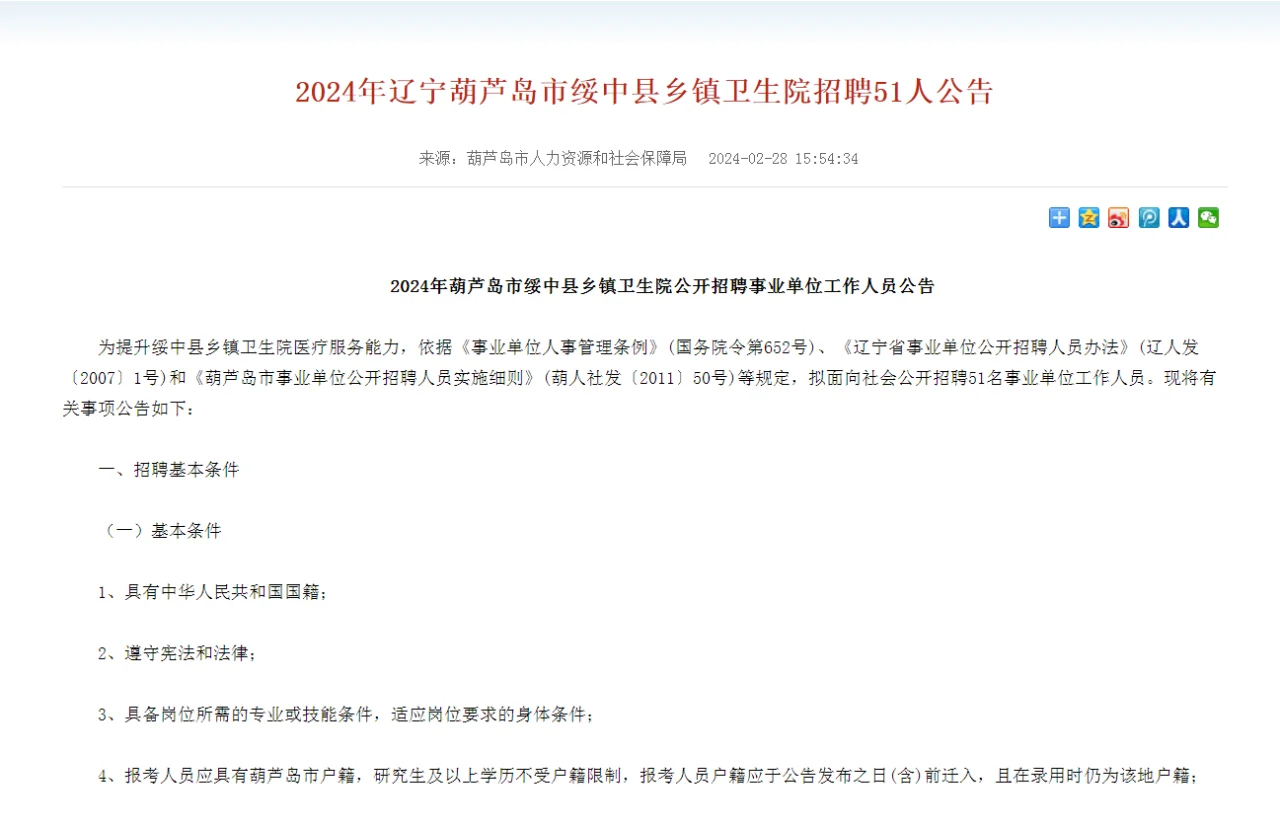 葫芦岛市绥中县乡镇卫生院招聘51人公告 招聘方式 本次招聘采取考试考核(笔试和面试)方式。 招聘岗位查询 绥中县乡镇卫生院公开招聘事业单位工作人员的具体招聘人数、岗位简介、资格条件等相关信息在葫芦岛市人力资源和社会保障局网站上统一发布,具体见《2024年葫芦岛市绥中县乡镇卫生院公开招聘事业单位工作人员岗位信息表》 报名 本次招聘采取网上报名及网上缴费的方式(考生请用电脑端进行报名和缴费),不设现场报名。 网上报名实行诚信承诺制度。网上报名程序如下: 1、报名时间:2024年3月5日9时至2024年3月6日16时。 2、提交报考申请。报考人员可于2024年3月5日9:00至3月6日16:00登录绥中县人社考试网进行报名并提交报考申请,报名时,应当仔细阅读诚信承诺书,提交的报考申请材料应当真实、准确、完整。报考人员提供虚假报考申请材料的,一经查实,将取消报考资格。 3、查询审查结果。招录机关于2024年3月5日9:00至3月6日17:00对报考申请进行审查,确认报考人员是否具有报考资格。报考人员可登录绥中县人社考试网查询审查结果。通过审查的,不能再报考其他职位。2024年3月5日9:00至3月6日17:00,报考申请未通过资格审查的,可以改报其他职位。2024年3月6日17:00以后,报考申请未通过资格审查的,不能再改报其他职位。对报考资格的审查贯穿录用全过程。在各环节发现报考者不符合报考资格条件的,均可取消其报考资格或录用资格。 4、上传照片。报考人员应上传本人近期免冠正面电子照片(蓝底或白底证件照,JPG或JPEG格式,照片宽度不低于295像素,高度不低于413像素)。照片上传之前均须通过“照片处理工具”进行处理、保存,否则无法完成照片上传和后续相关操作(报考人员可登录绥中县人社考试网下载)。 5、缴费确认。报考人员通过审查后,须于2024年3月5日9:00至3月7日16:00重新登录绥中县人社考试网报名系统缴纳考试费,考试费每科50元,两科合计100元。支付考试费用后务必重新登录网上报名系统确认“缴费成功”即为报名程序结束。 笔试内容:笔试内容为行政职业能力测验和公共基础知识,满分为100分。 面试形式:采取结构化面试的方法。 #事业单位 #2024考公季 #事业单位考试 |