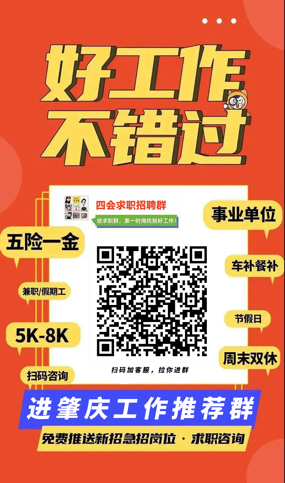 长按识别二维码,了解更多 四会广场店员综合月薪4-8K晋升快包吃住 4000-8000元/月 五险|提供食宿|住房公积金|节日福利|带薪年假|工作餐|年终奖|免费培训|晋升空间|年度旅游|定期体检 海底捞火锅 广东省肇庆市四会大道南19号四会广场四楼海底捞火锅 一、【招聘岗位】 服务员、门迎、传菜员、后厨、保洁、洗碗工等。 二、【职位要求】 1.学历不限; 2.身体状况符合国家餐饮行业要求; 3.无不良记录和嗜好。 三、【薪资标准】......