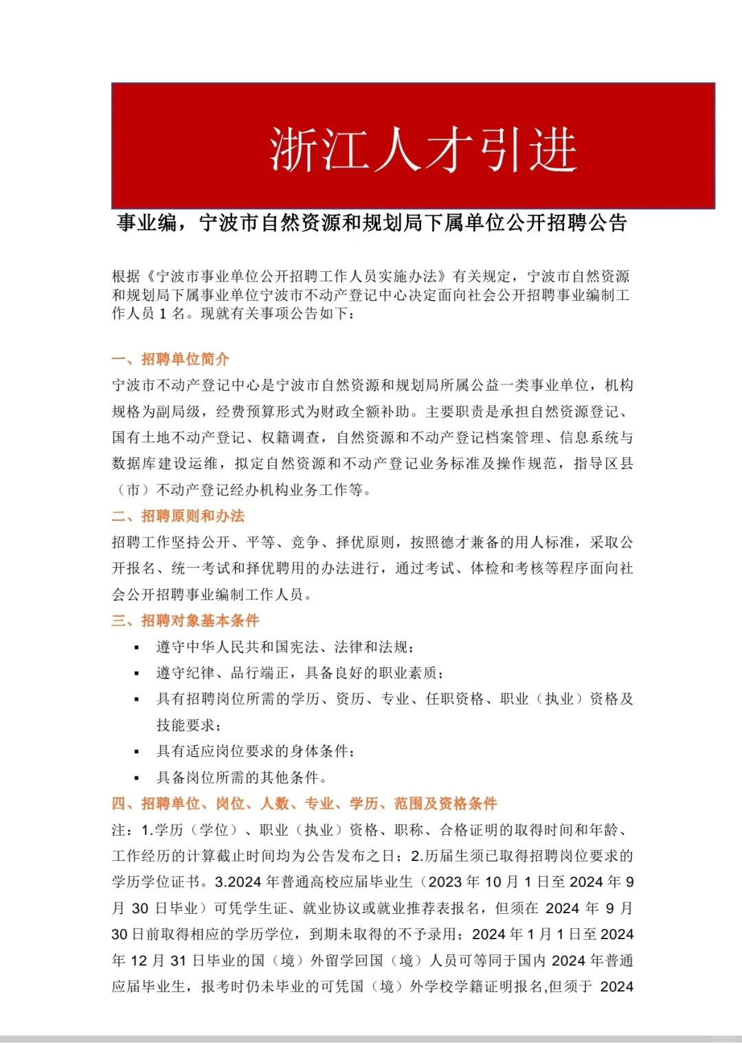 根据《宁波市事业单位公开招聘工作人员实施办法》有关规定,宁波市自然资源和规划局下属事业单位宁波市不动产登记中心决定面向社会公开招聘事业编制工作人员1名。现就有关事项公告如下: