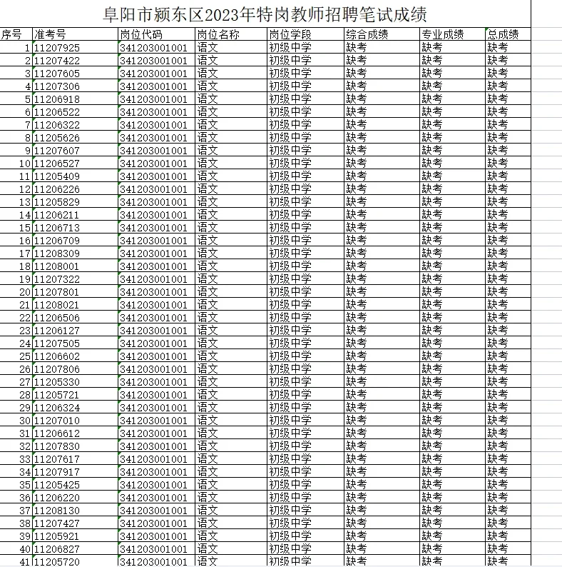 安徽省阜阳市颍东区特岗教师笔试成绩已出