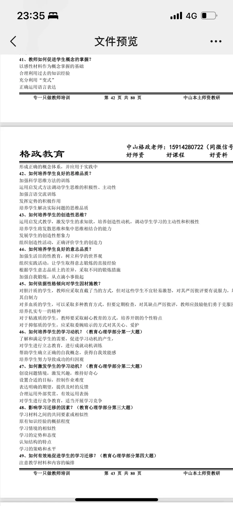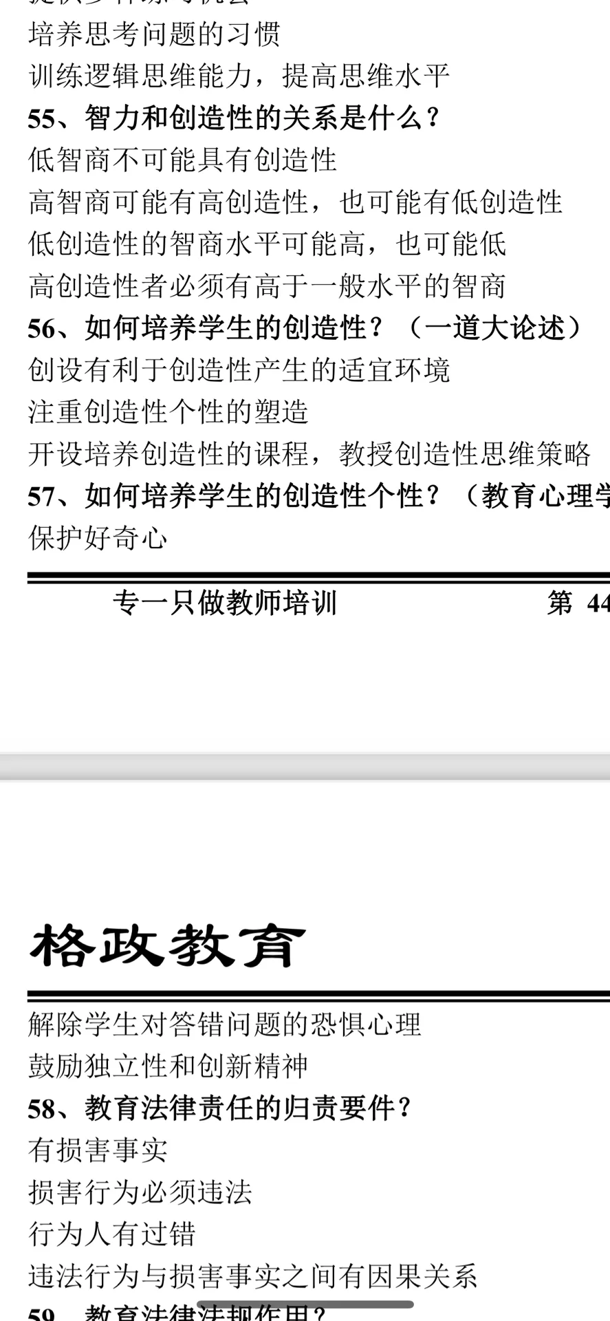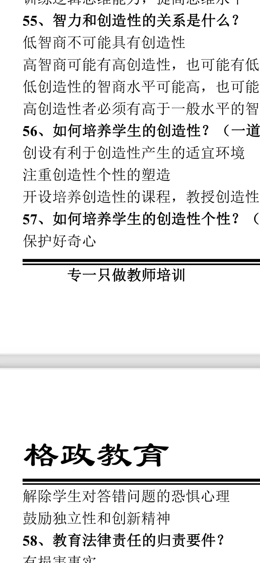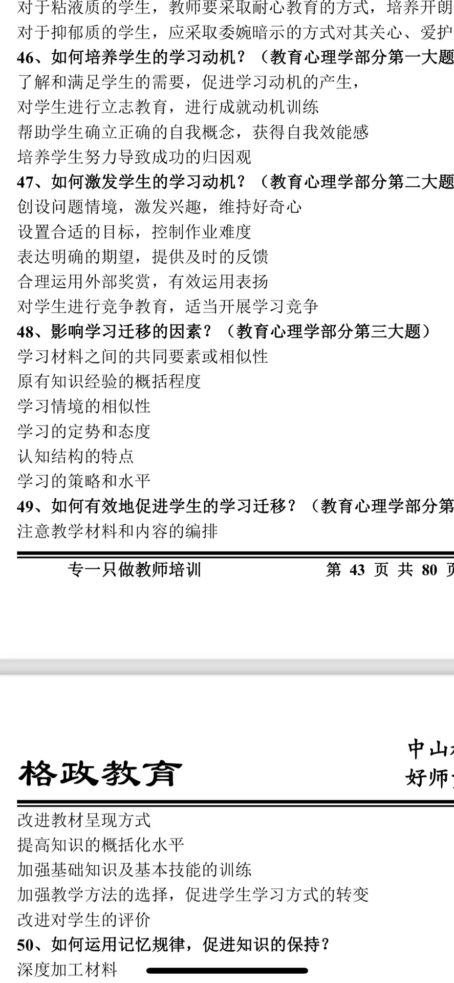 中山东区 #教师招聘考试 #中山东区 家人们,欢迎在评论区补充题目,对答案 选择题 1内发论的鼻祖,优生制?霍尔,高尔顿 2上品无寒门,下品无士族,哪个朝代 3时政,共青团活动在哪里举行,上海? 4党的什么伟大事业? 5什么党的理论创新? 6莱德古特,五种课程,经验课程 7教材的编定原则有哪几种 8补课,谁整治,教育行政部门? 9社会保护?包括法律,不让机构教学龄前儿童学习吗 10教育平民之父?晏阳初? 11教育适应自然?谁提出的 一,单,30题, 1.35分 二,多,10题 三,判,10题,0.9分 四,简答 1.学生观,5分 2.教学过程,5分 五,论述 1.教师如何培养创造性 六,案例分析(学习迁移 1.对话体现什么原理 2.怎么利用原理促进教学迁移 |