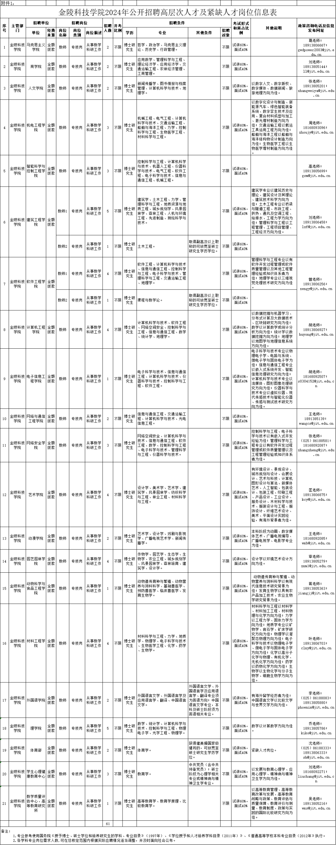 本次招聘相关信息在南京市人力资源和社会保障局网(http://rsj.nanjing.gov.cn)、金陵科技学院网(www.jit.edu.cn)发布,具体招聘岗位、数量、资格条件等详见《金陵科技学院2024年公开招聘高层次人才及紧缺人才岗位信息表》(附件1,以下简称《岗位信息表》)。