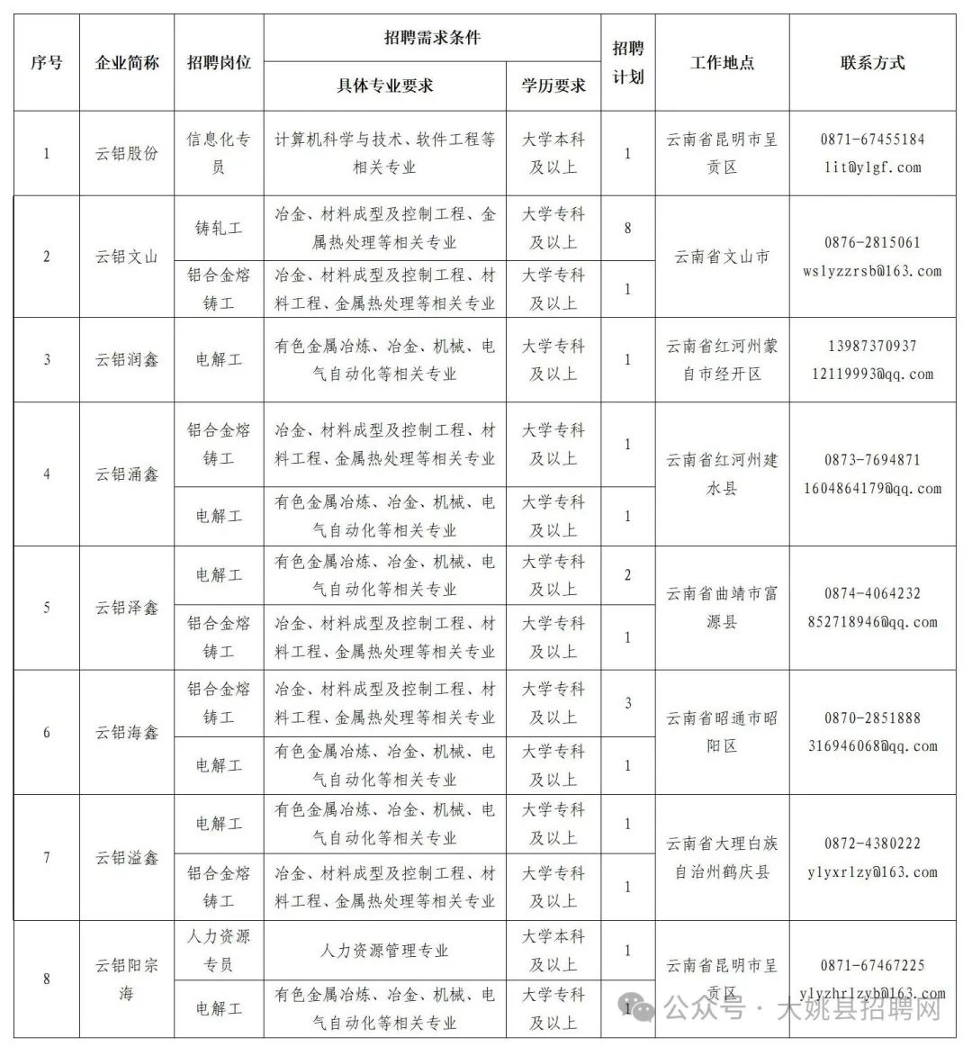 即刻关注,求职有我更轻松~ 云南铝业股份有限公司2024年高校毕业生招聘公告 一、企业简介 云南铝业股份有限公司(以下简称“公司”)系国有控股上市企业,始建于1970 年,1998 年改制上市(股票代码:000807),2018年12月正式进入中铝集团,是全国有色行业、中国西部省份工业企业中唯一一家“国家环境友好企业”,是中国“绿色低碳水电铝”发展的践行者。 多年来,公司坚持走绿色低碳发展之路,准确把握铝行业发展规律,以打造绿色、低碳、清洁、可持续的“水电铝加工一体化”产业模式为核心,构建了集铝土矿—氧化铝—炭素制品—铝冶炼—铝加工为一体的产业链。目前,公司旗下拥有十余家二级企业,具备年产铝土矿264万吨、氧化铝140万吨、水电铝305万吨、铝合金及铝加工产品160万吨、炭素制品80万吨的生产能力,总资产近400亿元。近两年利润总额分别为46.88亿元、59.07亿元。 当前,公司正在着力延链补链强链,积极推进基地经济发展,至2025年,将打造“3+3”六大绿色铝材一体化产业集群/基地(红河州、曲靖市、昭通市3个百万吨级产业集群,昆明市、文山州、大理州3个百亿级产业基地),力争全产业链产值达到1500亿元,招商引资集聚发展拉动产值1500亿元,实现原铝100%就地转化,形成从铝水到终端产品的“1+N”全产业链绿色发展格局。处于高速发展的云铝,期待优秀人才的加入。 二、招聘对象 2024年毕业的大专及以上学历应届毕业生。 三、招聘条件及要求 (一)遵纪守法,诚实守信,具有良好的品行和职业操守。 (二)身心健康,具有正常履行岗位职责的身体条件和心理素质。 (三)进取心强,具有相关的专业知识和工作能力。 (四)所提供的证件、资料真实有效。 (五)本科及以上学历须取得毕业证、学位证。 四、招聘计划