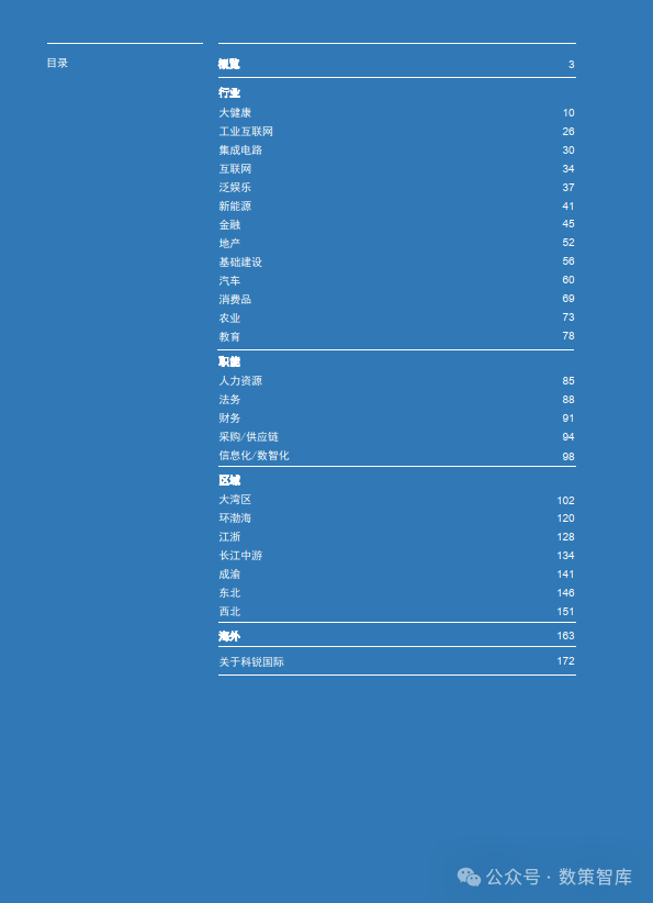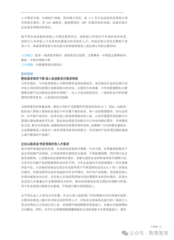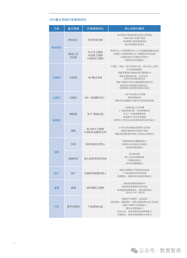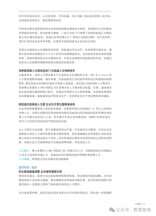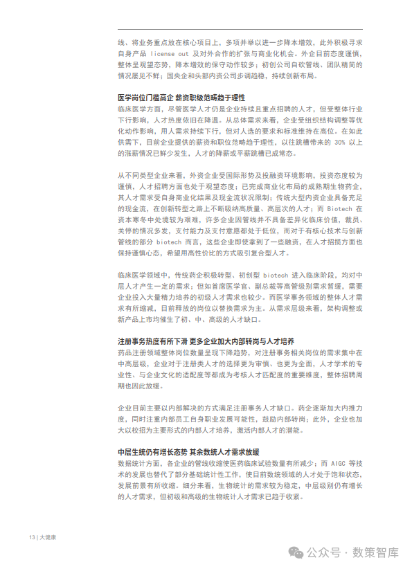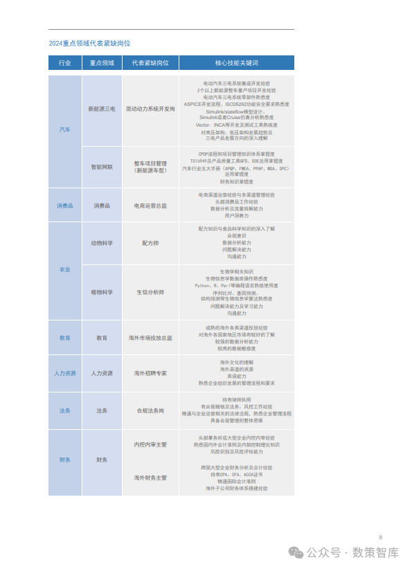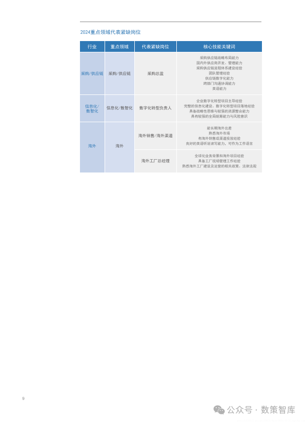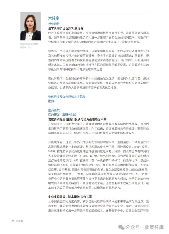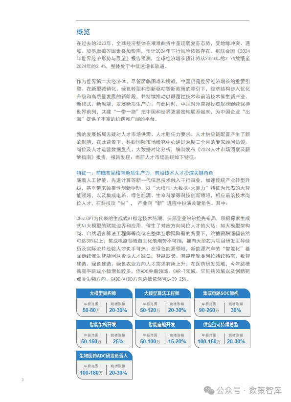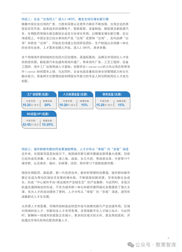 专业/及时/全面的行研智库 今天分享的是【2024人才市场洞察及薪酬指南】 报告出品方:科锐国际 报告共计:174页 【报告内容摘要如下】 特征二:企业“出海抢人”进入3.0时代,激发全球化增长新引擎 随着中国企业出海的广度、力度和深度以及竞争力都在不断加强,出海企业的类 型也百花齐放。越来越多的消费电子、智能家居、装备制造、新能源及新能源汽 车、生物医药领域头部及新锐企业发力全球化布局,以期激发增长新引擎。在出 海进程上,中国企业已经从单纯的产品“出海”或营销“出海”,走向品牌“出 海”和研发“出海”,开始在全球建立包括研发团队、生产制造以及销售一体化 的全球化业务,人才需求也随之升级,进入3.0时代。具体来看:多个领域海外营销端岗位包括大区经理岗、渠道拓展岗、品牌及市场岗位人才依 然持续热需;新能源汽车加速布局海外建厂,带来海外厂务、工艺工程师、设备 工程师、海外工厂运营高端人才紧缺;创新药企license-out的火热出海态势使海 外license BD岗需求上扬。与此同时,企业也越发重视自身全球管理能力和文化 融合能力,具备跨文化管理经验和跨国合作能力的专业人财法职能岗位人才成为 标配。