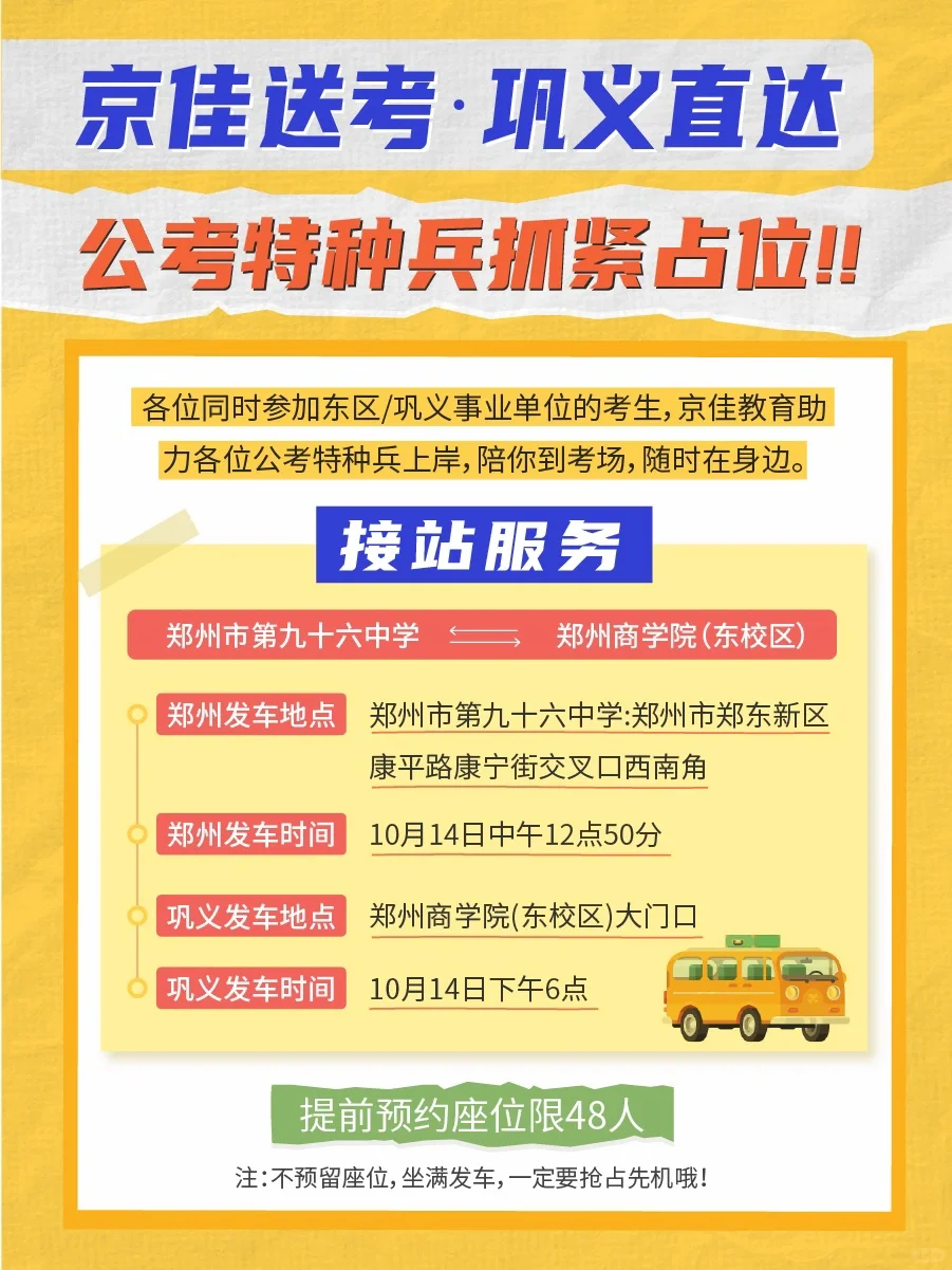 郑州东区—巩义事业单位爱心❤️助考大巴车 京佳教育为协助大家远距离考试 协助各位特种兵们接站服务 路线➡️郑州市第九十六中到郑州商学院东校区 上午东区考试结束后,大巴车等候各位到 12.50 分 到达大约下午 2 点之前 不过[清单R]不能给大家预留座位了 到点按照先后顺序就发车了 为大家方便记得一定进左下角群先预约下吧 最新消息巩义可以回郑州啦 #河南省考 #河南省公务员 #河南公务员 #河南特岗 #河南招教 #河南事业单位 #河南选调生 #河南三支一扶 #国考 #公务员考试 #河南省人才引进 #河南国考 #河南国企招聘 #河南国家电网 #公务员省考 #河南编制 #河南应届生 #京佳教育 #郑州事业编 #郑州市直事业编 #商品笔记扶苗计划 #双十一小红书买买节 #郑州东区事业单位#郑州巩义事业单位 |