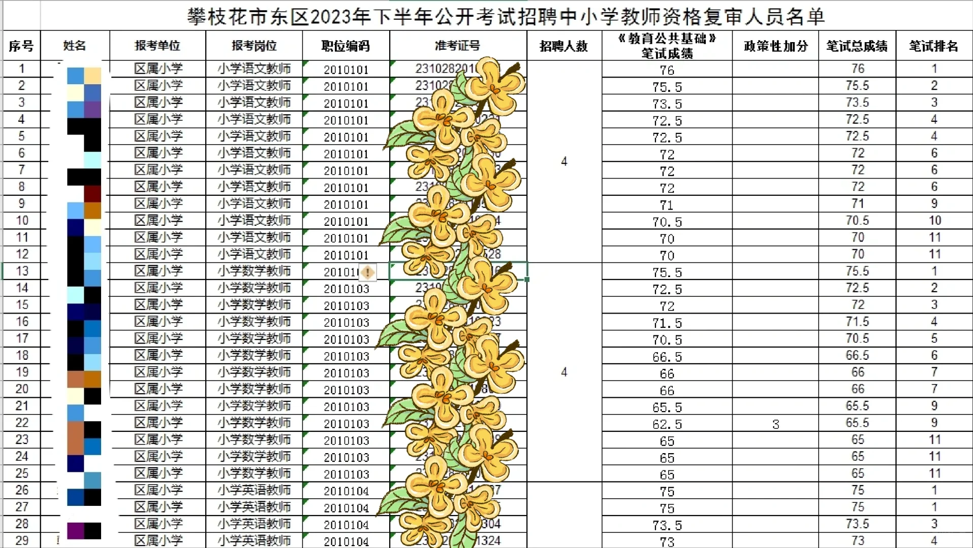 23年下攀枝花东区进面名单