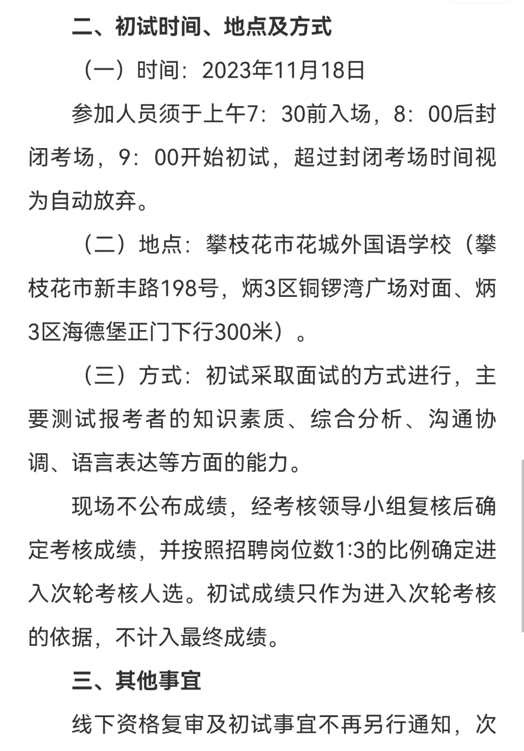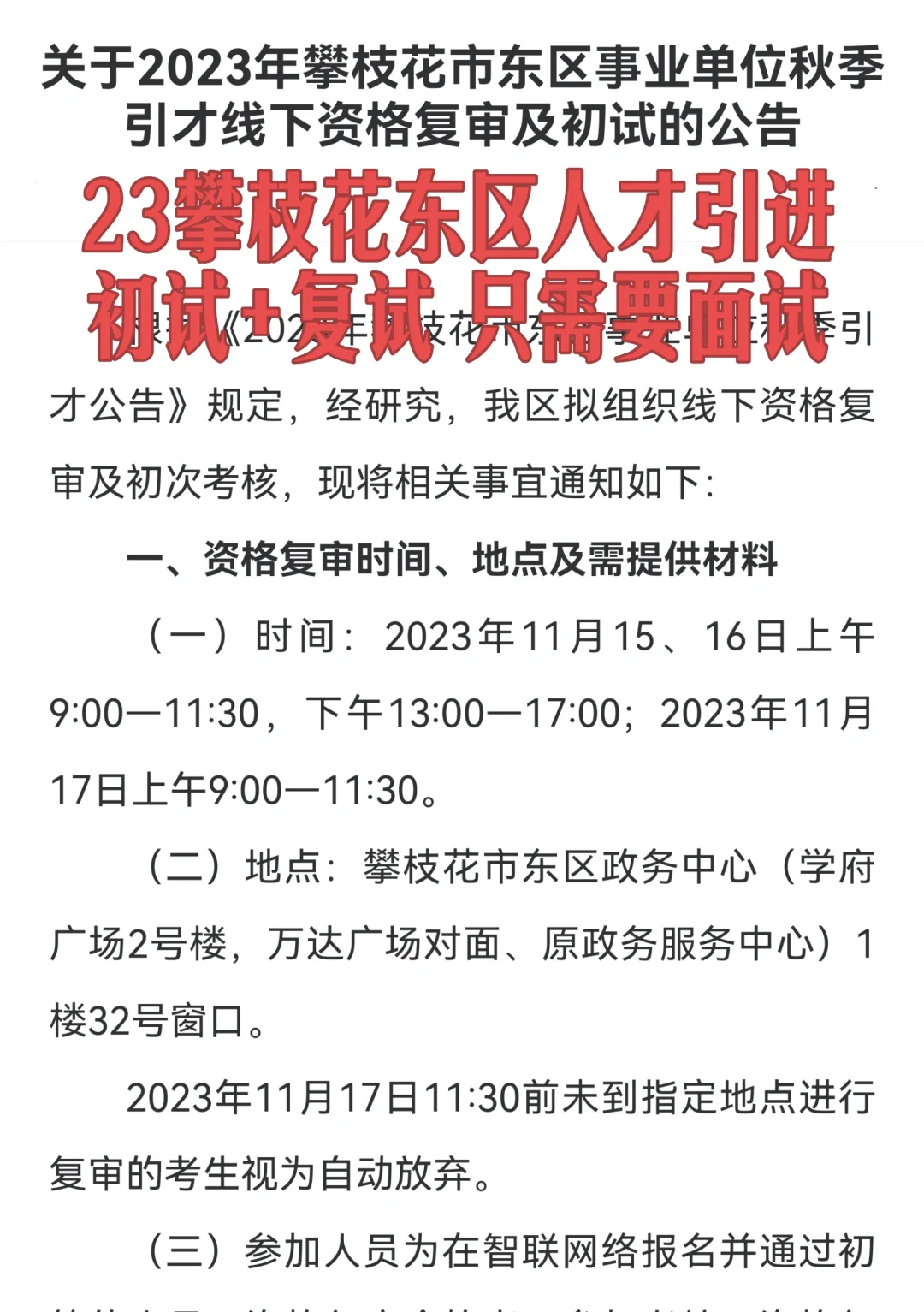 23下攀枝花东区人才引进已出 一、资格复审时间、地点及需提供材料 (一)时间:2023年11月15、16日上午9:00-11:30,下午13:00-17:00;2023年11月17日上午9:00-11:30。 (二)地点:攀枝花市东区政务中心(学府广场2号楼,万达广场对面、原政务服务中心)1楼32号窗口。 2023年11月17日11:30前未到指定地点进行复审的考生视为自动放弃。 二、初试时间、地点及方式 (一)时间:2023年11月18日 参加人员须于上午7:30前入场,8:00后封闭考场,9: 00开始初试,超过封闭考场时间视为自动放弃。 (二)地点:攀枝花市花城外国语学校(攀枝花市新丰路198号,炳3区铜锣湾广场对面、炳枝花市新丰路198号,炳3区铜锣湾广场对面、炳3区海德堡正门下行300米)。 (三)方式:初试采取面试的方式进行,主要测试报考者的知识素质、综合分析、沟通协调、语言表达等方面的能力。 现场不公布成绩,经考核领导小组复核后确定考核成绩,并按照招聘岗位数1:3的比例确定进入次轮考核人选。初试成绩只作为进入次轮考核的依据,不计入最终成绩。#攀枝花事业单位 #攀枝花人才引进 #人才引进 #攀枝花东区人才引进 #攀枝花 #攀枝花招聘 |