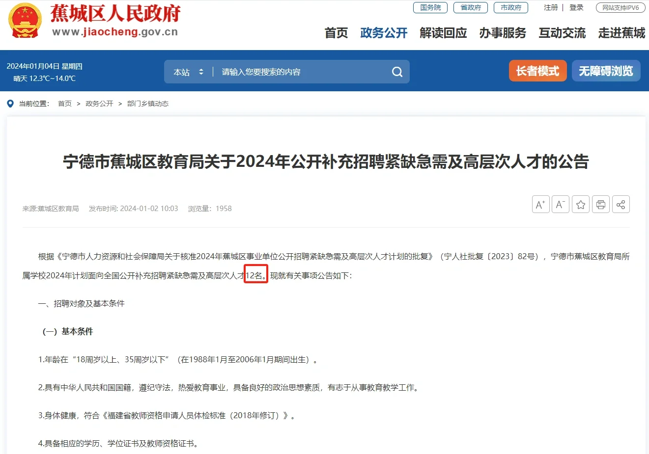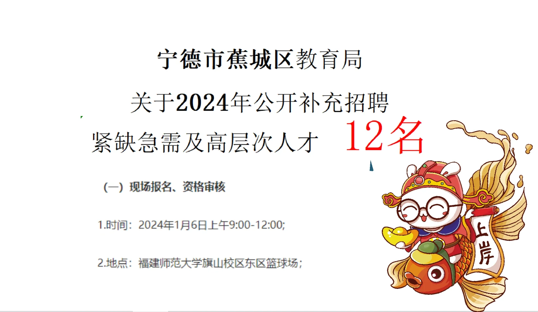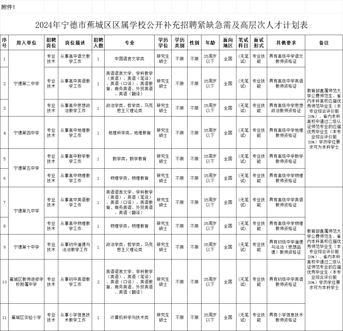 宁德市蕉城区教育局所属学校2024年计划面向全国公开补充高层次人才12名