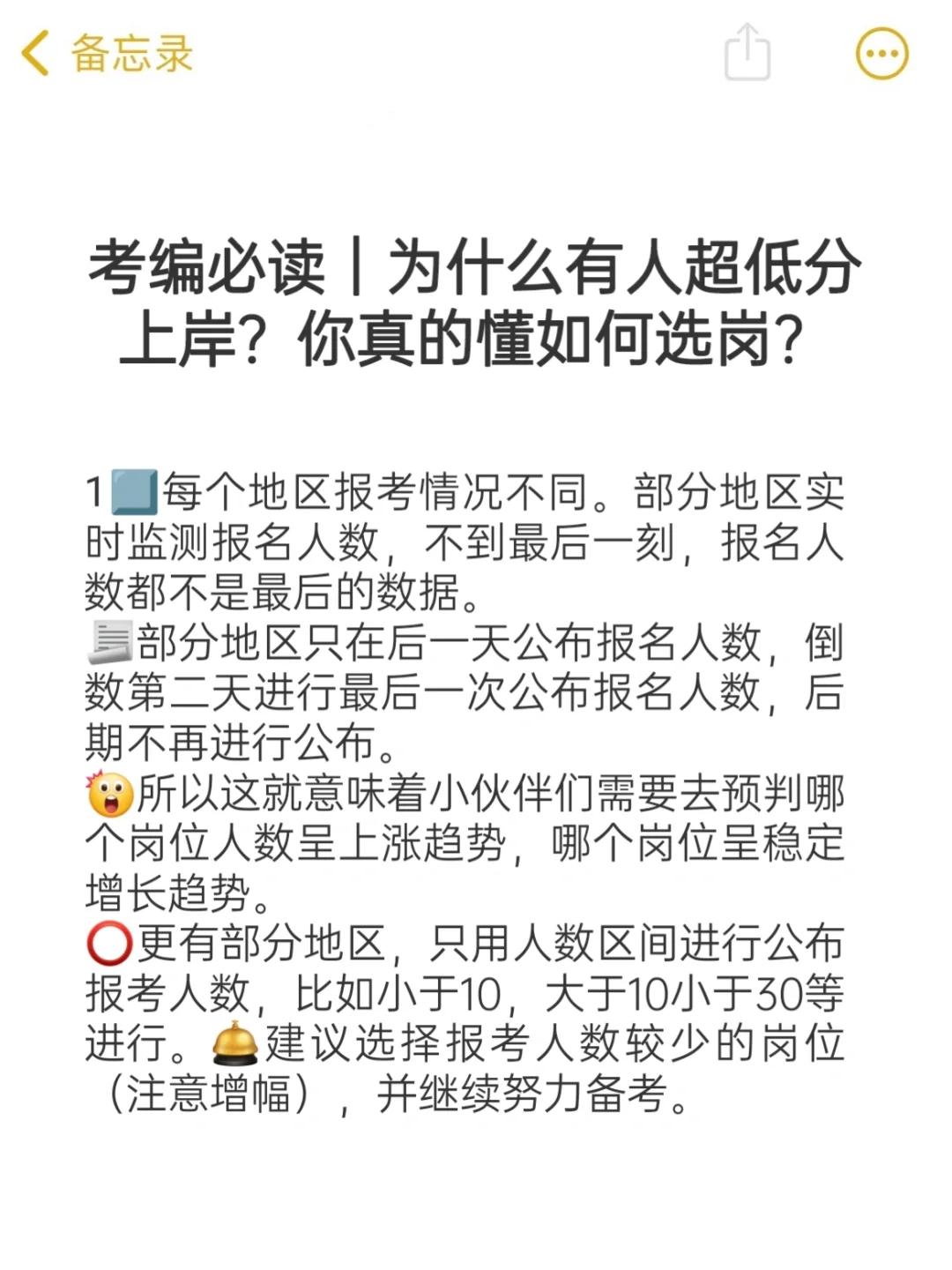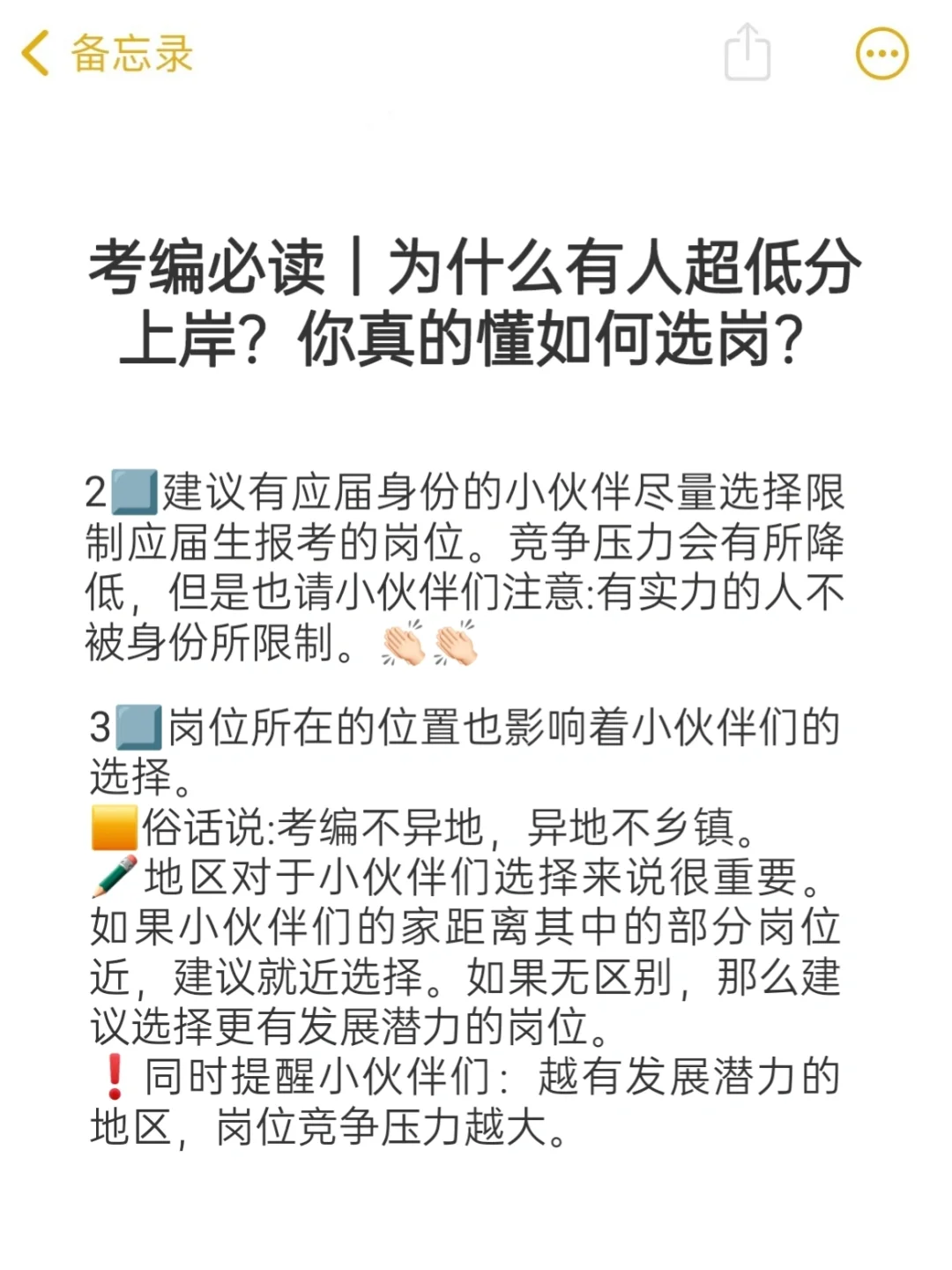 考教师编必读|为什么有人超低分上岸? 如何选择报考岗位对于如何报考岗位,每个人有每个人的想法,仁者见仁、智者见智。以下仅代表个人观点,希望小伙伴们做出明智的报考岗位选择。 1️⃣每个地区报考情况不同。部分地区实时监测报名人数,不到最后一刻,报名人数都不是最后的数据。 📃部分地区只在后一天公布报名人数,倒数第二天进行最后一次公布报名人数,后期不再进行公布。 😲所以这就意味着小伙伴们需要去预判哪个岗位人数呈上涨趋势,哪个岗位呈稳定增长趋势。 ⭕更有部分地区,只用人数区间进行公布报考人数,比如小于10,大于10小于30等进行。🛎️建议选择报考人数较少的岗位(注意增幅),并继续努力备考。 2️⃣建议有应届身份的小伙伴尽量选择限制应届生报考的岗位。竞争压力会有所降低,但是也请小伙伴们注意:有实力的人不被身份所限制。👏🏻👏🏻 3️⃣岗位所在的位置也影响着小伙伴们的选择。 🟨俗话说:考编不异地,异地不乡镇。 ✏️地区对于小伙伴们选择来说很重要。如果小伙伴们的家距离其中的部分岗位近,建议就近选择。如果无区别,那么建议选择更有发展潜力的岗位。 ❗同时提醒小伙伴们:越有发展潜力的地区,岗位竞争压力越大。 #滕州教师编 #枣庄教师招聘 #滕州教师招聘 #教师考编 |