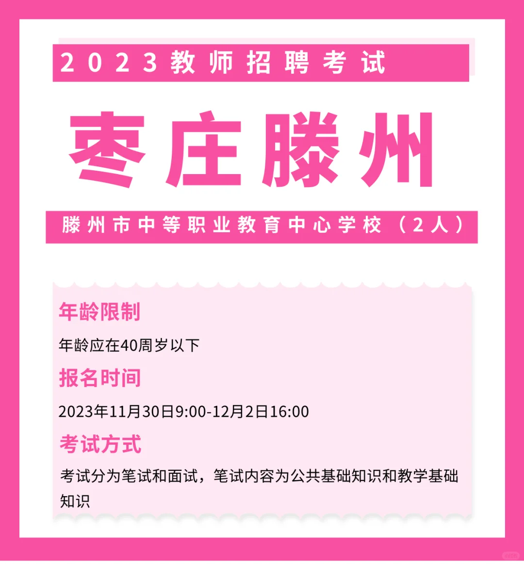 滕州中等职业教育中心学校招聘2人 滕州中等职业教育中心学校招聘2人 关键信息如下 年龄应在40周岁以下(1982年11月30日以后出生) 报名时间:2023年11月30日9:00-12月2日16:00 考试分为笔试和面试,均采用百分制计算成绩。 笔试内容为公共基础知识(包括法律法规、政治经济理论、时政方针、科技知识等基础性知识)和教学基础知识(包括教育学、心理学等教育专业知识)笔试成绩满分为100分。 面试根据岗位要求采取结构化面试的方式进行,主要通过表达能力、教学方法、组织协调能力、专业知识储备、技能水平等方面测评应聘人员是否具备招聘岗位所需的基本素质和基本技能。 面试结束后,按笔试成绩占40%、面试成绩占60%的比例计算应聘人员总成绩。 #教师编制 #教师招聘 #教师招聘考试 #教师考编 #教师编 #潍坊教师招聘 |