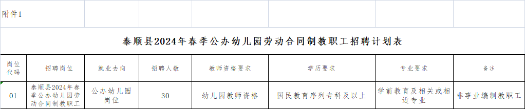为进一步加强幼儿教师队伍建设,促进我县幼儿教育事业稳步、健康发展,根据《人力资源社会保障部办公厅 教育部办公厅关于做好2021年中小学幼儿园教师公开招聘工作的通知》(人社厅发〔2021〕27号)精神,经研究,决定面向社会公开招聘泰顺县2024年春季公办幼儿园劳动合同制教职工。现将有关事项公告如下: 一、招聘条件 (一)具有中华人民共和国国籍,思想政治素质好,遵纪守法,身体健康,热爱教育事业,志愿从事教育工作,符合新时代幼儿园教师职业行为十项准则要求,无刑事犯罪记录和其他不得聘用的违法记录。 (二)具有与履行招聘岗位相适应的职业道德素质、业务知识水平、教育教学能力和心理素质。 (三)年龄要求:年龄为35周岁及以下(1989年3月8日及以后出生)的国民教育系列专科或本科毕业生;年龄为40周岁及以下(1984年3月8日及以后出生)的国民教育系列硕士研究生及以上学历毕业生。 (四)户籍要求:具有泰顺县常住户口,或者泰顺县籍贯且父母至少一方具有泰顺县常住户口的国民教育系列专科及以上应、历届毕业生(户口落户时间以2024年3月8日的户口所在地为准);具有硕士研究生及以上学历学位的毕业生户籍不限。 (五)学历要求:报考对象应取得国民教育系列专科及以上学历。 学历以国家教育行政机关认可的相应证件文书为准。招考专业参考高校专业设置目录审查认定,大学本科专业参考《教育部关于印发<普通高等学校本科专业目录(2012年)〉》规定执行;大学专科专业参考《教育部关于印发〈普通高等学校高等职业教育(专科)专业设置管理办法〉和〈普通高等学校高等职业教育(专科)专业目录(2015年)〉的通知》(教职成〔2015〕10号);研究生专业参考《授予博士、硕士学位和培养研究生的学科、专业目录》(2008更新版)。 (六)教师资格证及普通话要求。报考对象须持有幼儿园教师资格证书,须具备二乙及以上普通话等级证书。 (七)因相应考试违规违纪行为被各级人事考试机构处罚且尚在禁考期内的人员,不得报考。 二、招聘岗位及要求 (一)招考岗位:公办幼儿园劳动合同制教职工30名,具体招聘计划指标详见《泰顺县2024年春季公办幼儿园劳动合同制教职工招聘计划表》(附件1)。 (二)岗位要求:报考公办幼儿园劳动合同制教职工岗位的必须是学前教育及相关或相近专业毕业,且具备幼儿园教师资格。 三、招聘办法 坚持“民主、公开、竞争、择优”的原则,经报名、审核、考试、体检、考察等程序,择优聘用。 (一)报名程序 1.报考泰顺县2024年春季公办幼儿园劳动合同制教职工岗位的考生,请在2024年3月8日-3月10日(上午8:30—12:00,下午2:00—5:30)现场提交由本人填写的《泰顺县2024年春季公办幼儿园劳动合同制教职工招聘报名表》(附件2),携带相应报名材料报名。报名地点:泰顺县教育局七楼会议室(罗阳镇文星路51号),联系人:傅老师,联系电话:0577—67594635。 2.现场报名时提交由本人填写的《泰顺县2024年春季公办幼儿园劳动合同制教职工招聘报名表》(附件2),并同时携带以下材料报名: (1)本人身份证、户口簿,父母的户口簿原件和复印件(本人户口在泰顺的提供户口本;本人户口不在泰顺的须提供有迁出、注销记录的户口本;与父母分开不同户口本的,还须提供由公安部门出具的父母子女关系、籍贯证明); (2)现场提供毕业证书、普通话等级证书、教师资格证书原件及复印件《中国高等教育学生信息网(学信网)学历证书电子注册备案表》打印件。 (3)近期一寸免冠彩照2张;委托他人报名须提供委托书及受托人的身份证原件及复印件。 (二)资格审核 报名结束后,县教育局根据选报岗位条件进行资格审核。通过资格审查符合招聘岗位报考条件的人数与岗位招聘计划数达不到1.5:1比例,将按规定相应核减招聘计划数,相应情况在泰顺县人民政府网站(http://www.ts.gov.cn/)上发布公告。 (三)考试 考试采取笔试和面试相结合,以先笔试后面试的方式进行。考试总成绩由笔试成绩的40%和面试成绩的60%相加构成。面试成绩分数核算到小数点后两位(尾数四舍五入)。 (1)笔试 ①形式:闭卷笔试。 ②分值:满分100分。 ③内容:包括教育学、心理学及教育政策法规等理论知识(占20分)和相应学科教学理论与专业知识等(占80分)。 (2)面试 根据参考人员笔试成绩从高分到低分按招聘岗位计划数1:1.2比例进入面试,达不到比例的按实际参考人员确定参加面试对象。如遇最后一名同分的,一并进入面试。 ①分值:满分100分。面试成绩低于60分的,不予录取。 ②形式和内容:采用模拟课堂教学的形式进行试课,试课内容为报考学科岗位的教材(泰顺县内相应学科现行教材)内容,主要考查教学设计能力、掌握教学内容能力、教学组织能力、教学基本素养等。 ③其他说明:所有试课对象须按照规定的时间、地点和要求,携带本人身份证、《试课通知书》参加试课。不按规定时间、地点和要求参加试课的,视作自动放弃。 笔试与面试时间、地点另行通知。 (四)体检 根据考试总成绩从高分到低分情况,按招聘计划的1:1比例确定体检对象;总成绩同分的,取面试成绩高分者进入;总成绩、面试成绩均相同的,组织同分对象再次试课,取本次试课成绩高者进入。体检参照公务员考录体检标准执行。体检时间另行通知,体检费用考生自负。 (五)考察 体检合格人员为考察对象。考察采取调阅查看考生个人的
