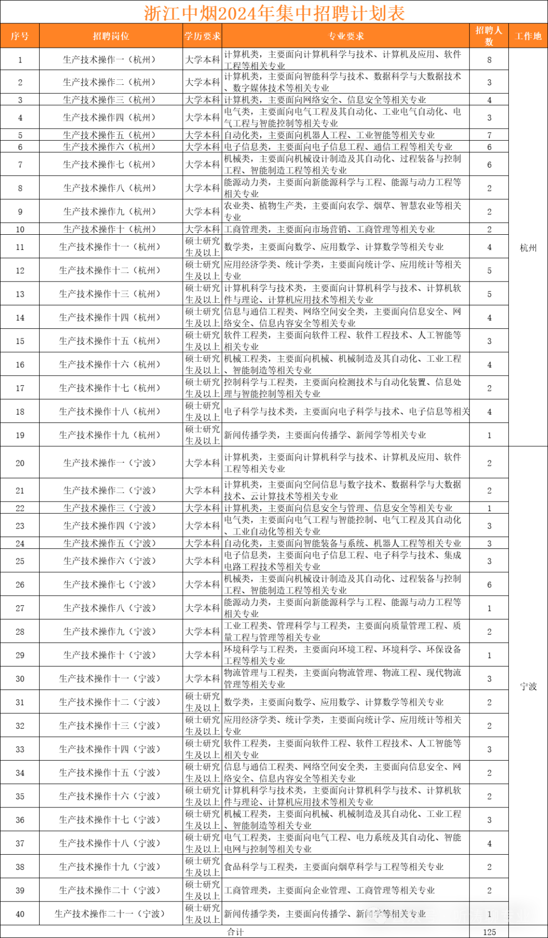 本次集中招聘40个岗位共125人,具体招聘岗位、人数和相关要求见《浙江中烟2024年集中招聘计划表》(附件1)。