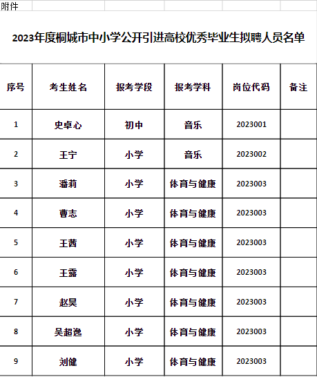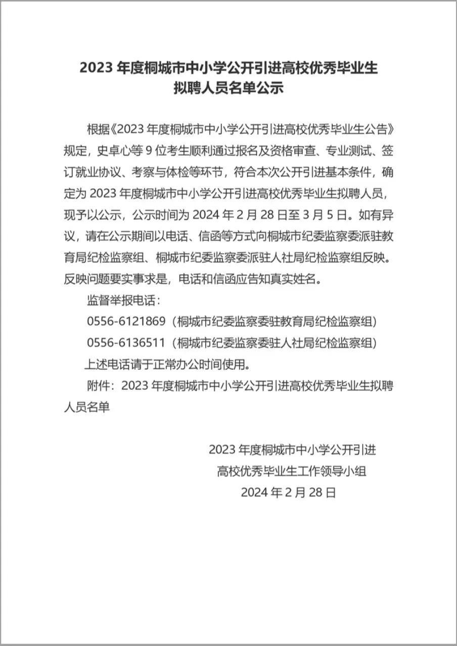 2023年度桐城市中小学公开引进高校优秀毕业生拟聘人员名单公示