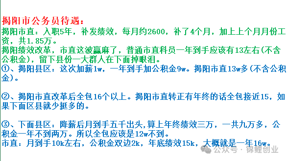 人的初始天性本是善良的,每个人生来都拥有内在的美好品行。然而,随着岁月的流逝、经历社会的毒打,我们逐渐被外界的世俗所影响,被世俗的纷扰所浸染。原本纯净的本性被物质欲望所掩盖,我们开始沉溺于贪婪、嗔恨与痴迷之中,为了寻求外界的赞许和认同而迷失自我。长此以往,内心的尘埃越积越厚,我们离真实的自我越来越远。 某机构近期对广东揭阳的公务员待遇进行了曝光。实际上,公务员的待遇因入职年份的不同而有所差异,并且薪酬信息是被严格保密的,只有相关公务员自己才清楚具体的薪资情况。体制内的薪酬并非固定不变的,公务员的待遇经常是会根据当地的发展状况进行上下浮动调整。薪酬是向上调整还是向下调整,受到多种因素的影响,这些因素对于在职的公务员来说应该更加清楚。毕竟,员工对自己所在单位的薪酬体系往往有着最深入的了解。公务员的薪酬构成并非单一,而是由基本工资、奖金、公积金等多部分组成。然而,公务员的优势并不仅仅在于待遇,更在于其工作的稳定性和社会地位。对于揭阳公务员的薪酬的具体细节,可以参考机上面整理的数据,但更为重要的是要结合自己的实际情况进行对比,看看是否存在出入。毕竟,不同的单位、不同的区域以及不同的入职时间,都会导致薪酬上的差异。揭阳是广东省14个沿海地级市之一,也是广东沿海经济带东翼主战场。它拥有优越的地理位置和便捷的交通网络,揭阳也是广东制造业重要基地,拥有多个经济功能区和产业园区,构建了揭阳中心城区、普宁主城区、揭阳滨海新区(惠来)三个粤东城市群城市中心和揭西生态发展示范区“三中心一示范区”区域协调发展布局。揭阳仍在享受着广东经济发达所带来的红利,因此在薪酬待遇上具有一定的优势。揭阳公务员的年薪范围大致在12-16万之间,相较于内陆地区,这一水平显然更为优渥。这也不难理解,毕竟沿海地区,待遇自然更为吸引人。在广东地区,公务员的竞争尤为激烈,这与其薪酬待遇的优势密不可分。如果你对广东省情有独钟,那么在选择城市时,可以考虑那些房价和物价相对较低的地方。这样一来,你的幸福感或许会更加强烈。 在揭阳地区,普通职员的月薪大多分布在2000至13000元之间,而其中有高达一半的岗位月薪集中在3,000至6,000元,对应的年薪则在4万至7万之间。面对这样的薪酬情况,你会选择找个普通工作还是挤破头去考公务员呢?很多人对体制内工作心生向往,但苦于没有机会进入。这其中的原因多种多样,每个人可以根据自己的职业发展规划,职业追求去选择是否考公,无论如何,了解自己的动机和需求,才能更好地规划自己的职业道路。 揭阳虽然人口众多,但其经济总量相对一般,这反映出当地的产业发展还有待提升。实际上,地方产业的繁荣与发展是提升当地职员薪酬水平的关键因素。当产业发展蓬勃时,企业能够提供更多的高薪职位,从而吸引和留住人才。 人口和经济总量是衡量一个地区发展水平的重要指标。它们不仅影响着当地的就业市场和薪酬待遇,还直接关系到个人的职业发展和未来前景。因此,我们应该密切关注这两个因素的变化,以便更好地规划自己的职业道路和未来发展。总的来说,揭阳公务员的待遇还是相当不错的。即使有所调整,其待遇也仍然比许多其他地区具有优势。在经济发达的省份工作,薪酬水平自然会更高,这是不言而喻的。因此,选择去哪里工作是一个需要慎重考虑的问题。无论最终选择哪种工作,只是不同的工作环境与方式,大可不必太在意,关键是能满足自己的内心追求才会幸福。今天就到这,关注我,长期日更! 【降薪后广东省揭阳市公务员待遇被泄露,如果你也赞同我的观点,请帮忙点赞关注+在看! |