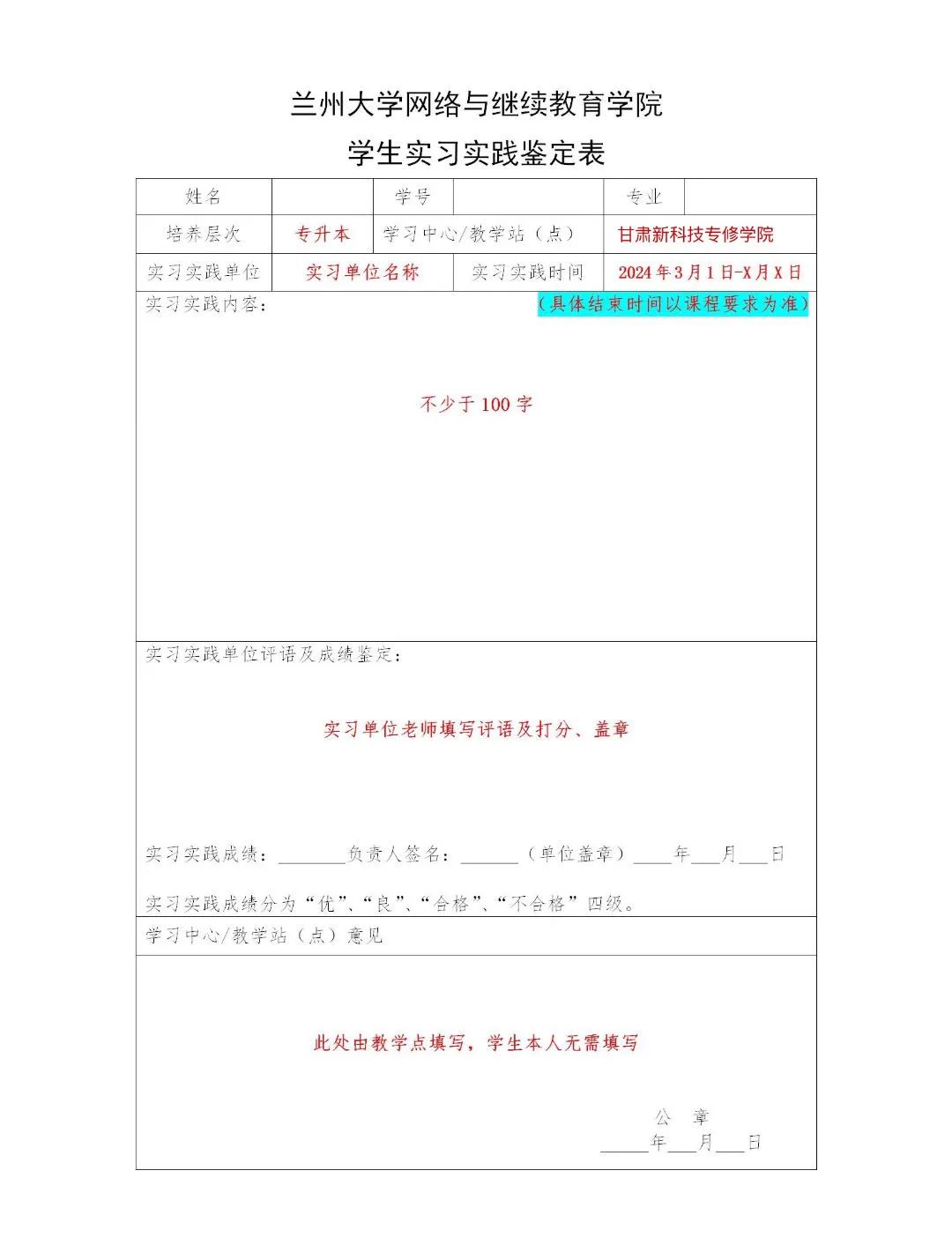 2、各专业需提交实习鉴定表及实习手册的请使用A4纸打印后黑色中性笔填写,按要求由相关实习单位盖章后交送至我教学点。