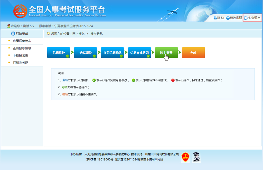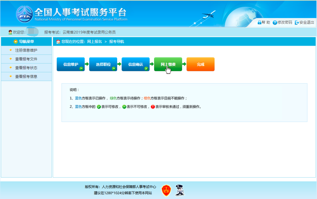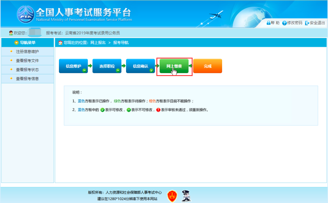 通过审核的考生可以进行网上缴费,点击报考流程中“网上缴费”选项,可以进入网上缴费的页面,如下图所示: