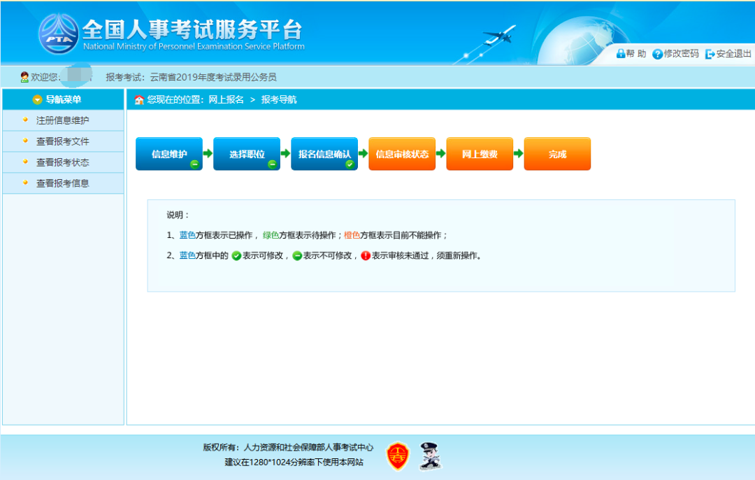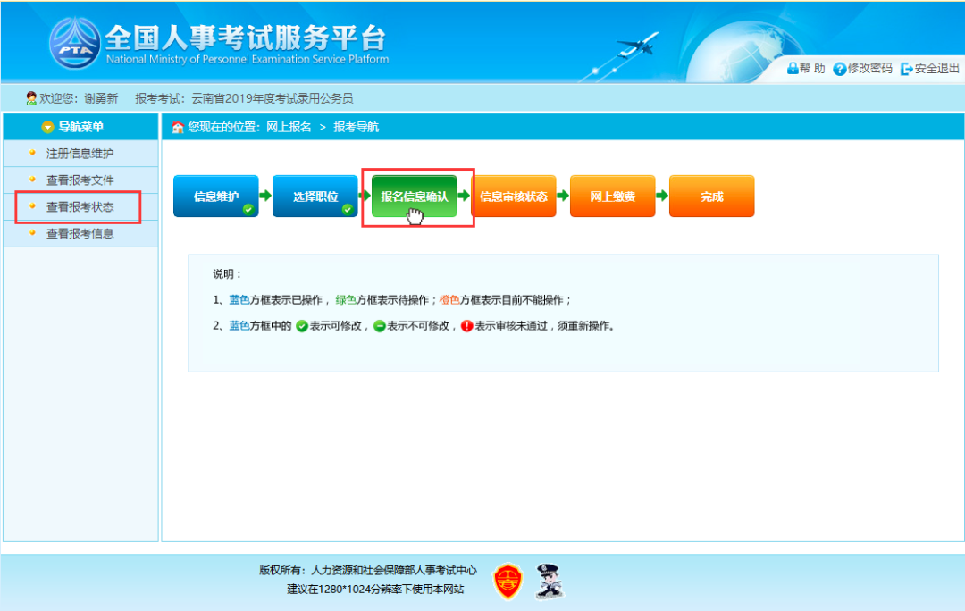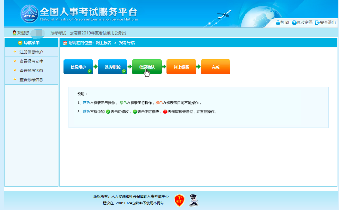 通过点击“确认”按钮,提示确认成功后跳转到报考流程页面,则完成填报信息操作。如下图所示: