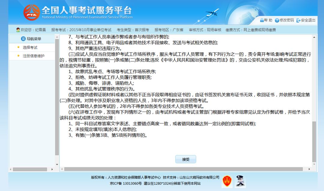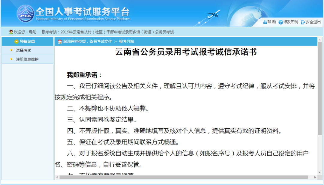 点击“接受”按钮,进入查看考生承诺书的页面,如下图所示: