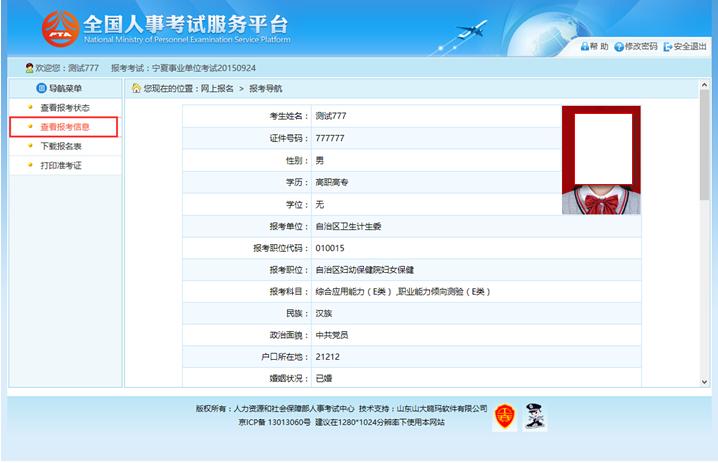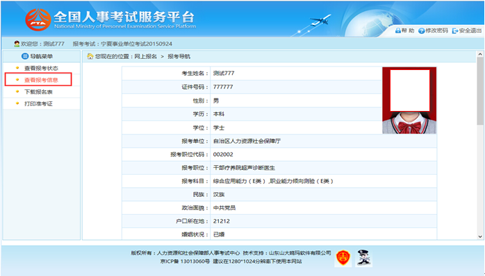 考生可以通过点击“查看报考信息”按钮,查看考生填写的报考信息,如下图所示: