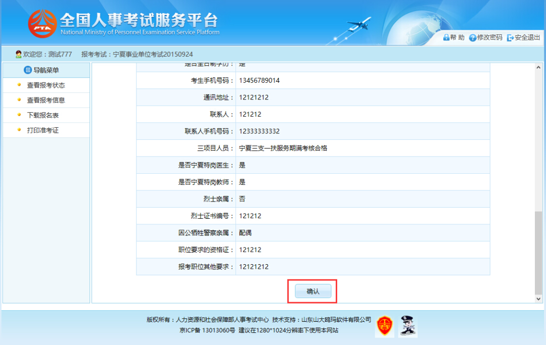 点击“报名信息确认”按钮后,跳转到报名信息确认页面,如下图所示: