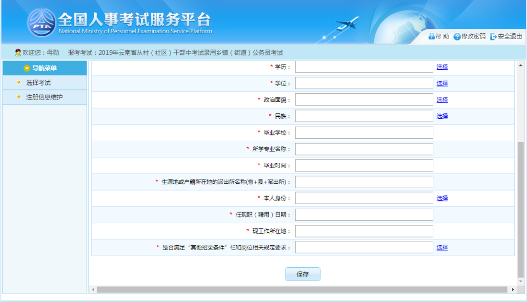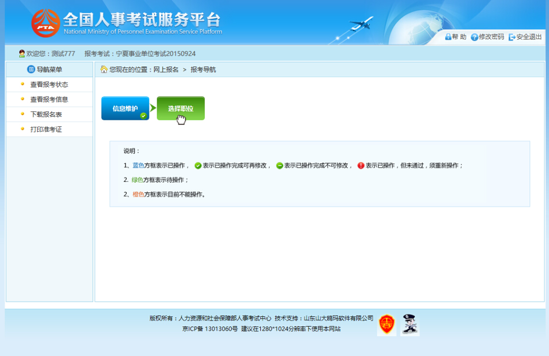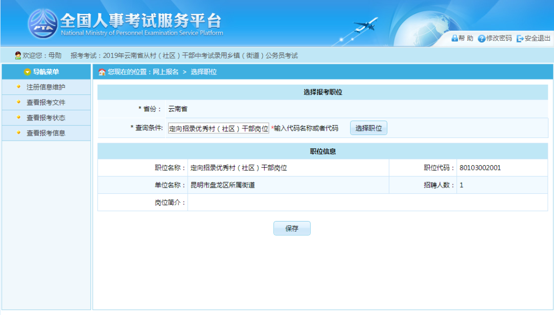 选择相应的职位,点击“保存”按钮,提示保存成功。保存成功后会根据所报考的职位及计算机审核情况跳转到如下报考流程页面。