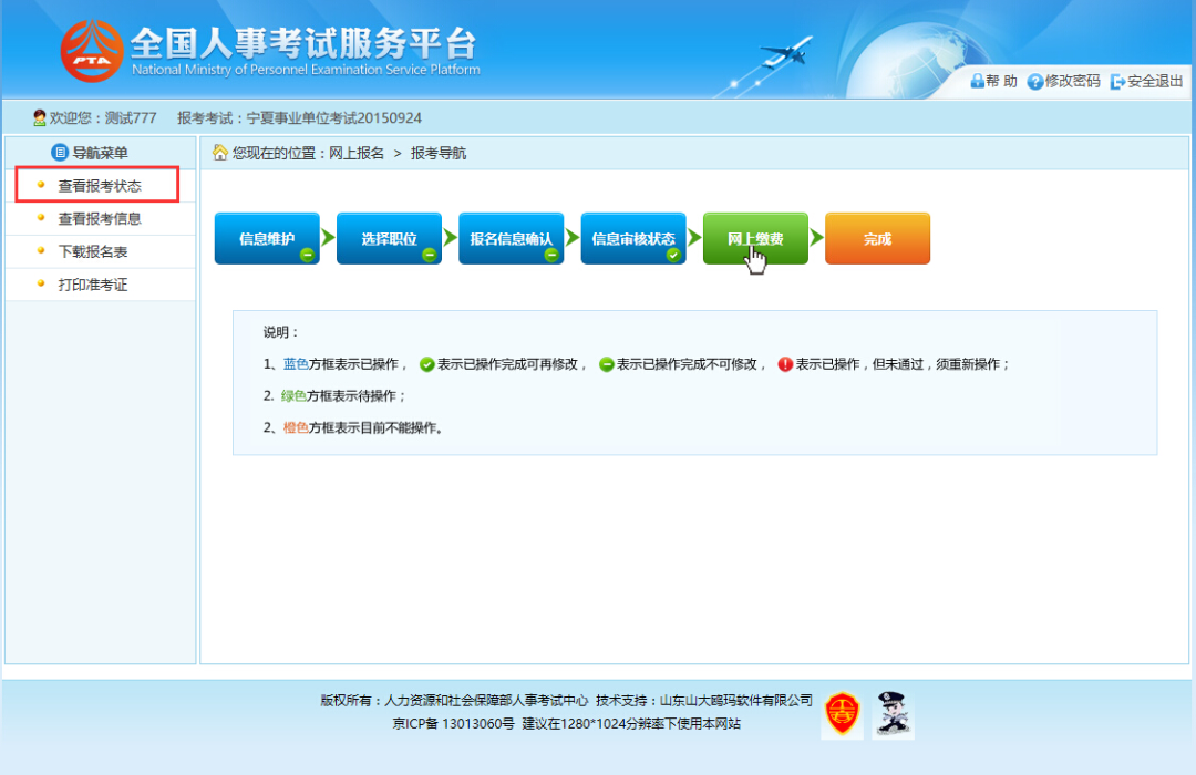 点击系统导航菜单的“查看报考状态”选项,可进入查看状态页面。如下图所示: