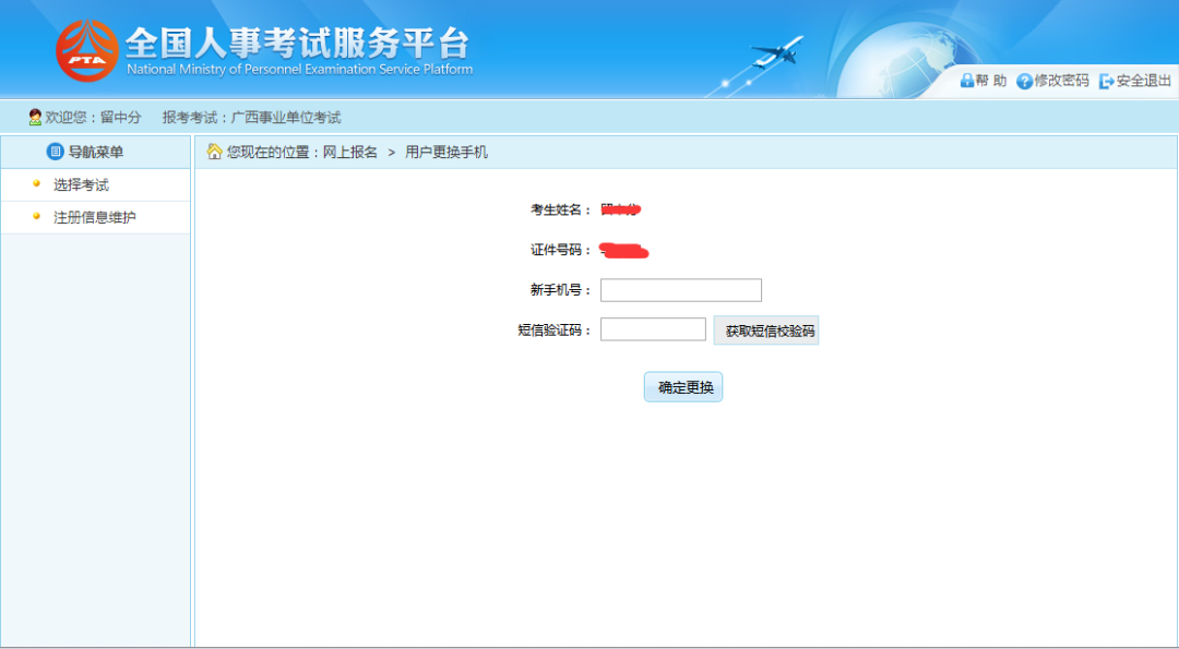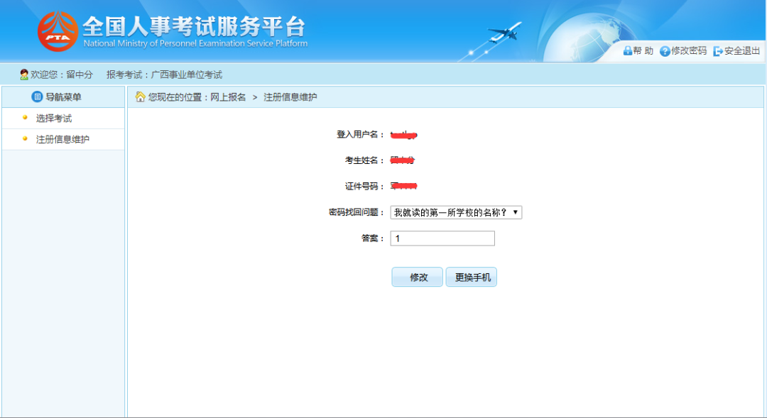 通过点击系统导航菜单中“注册信息维护”选项,可跳转到修改注册信息页面,其中登入用户名、考生姓名和证件号码等考生关键信息不允许进行修改,如下图所示: