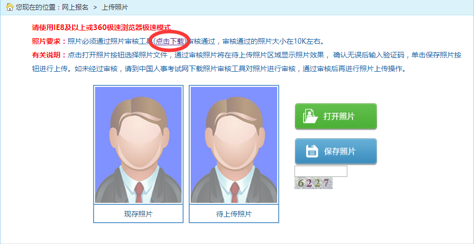 点击“照片要求”中的“点击下载”下载照片审核处理工具,处理报名照片,照片通过审核工具审核后,点击“打开照片”按钮选择要上传的照片,输入验证码,点击“保存照片”,上传成功后跳转到照片确认页面,如下图所示: