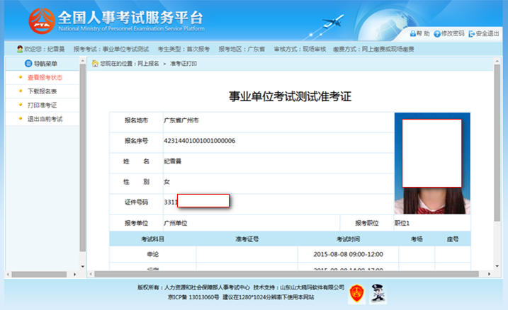 通过点击系统导航菜单的“打印准考证”选项,可进入准考证打印页面,如下图所示: