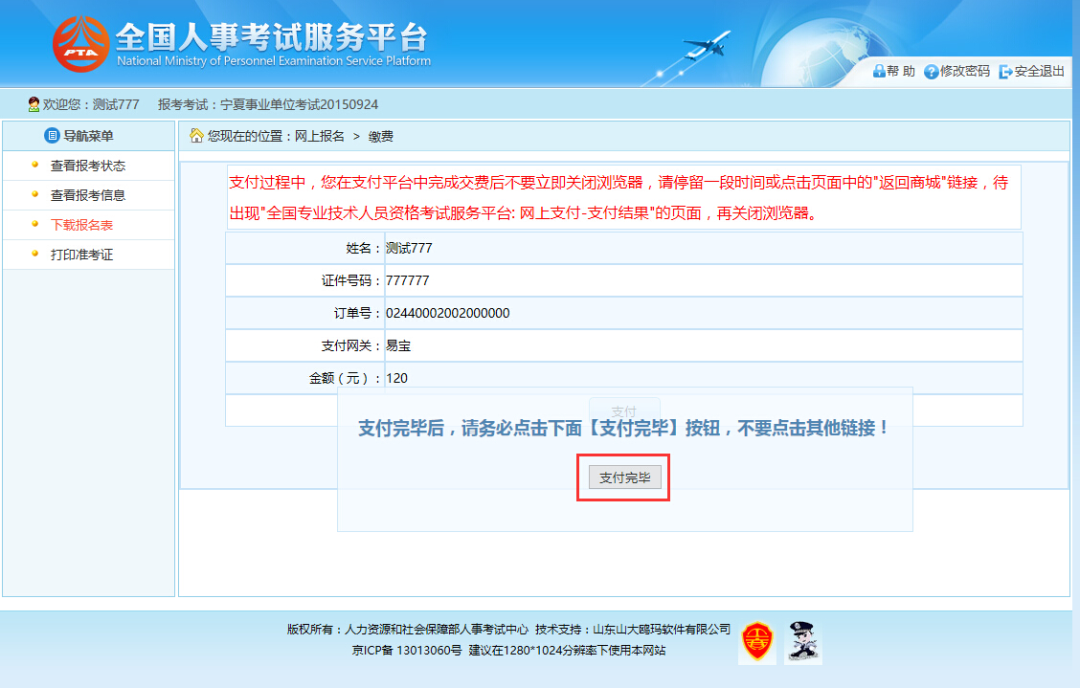 选择完成后点击“生成订单”按钮,可以生成订单,订单确认无误后,点击“支付”按钮,成功后再点击“支付完毕”按钮完成网上支付操作,如下图所示: