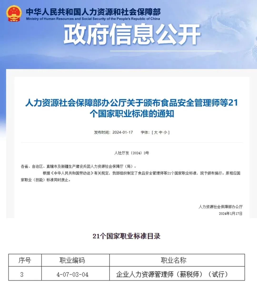 2024年1月19日,由中国人才交流协会、中国商业联合会、上海财才网信息科技有限公司为主起草的《企业人力资源管理师(薪税师)国家职业标准(技能类)》(试行)(以下简称“标准”)正式发布,详见人力资源和社会保障部《关于颁布食品安全管理师等21个职业标准的通知(人社厅发〔2024〕3号)》。