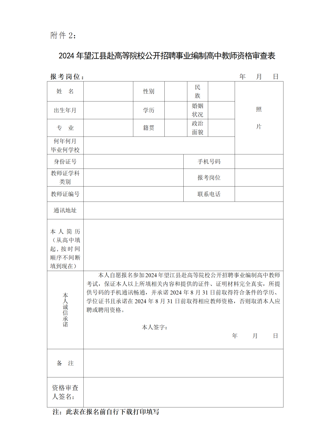 附件2:2024年望江县赴高等院校公开招聘事业编制高中教师资格审查表;