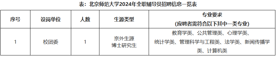 为进一步加强北京师范大学辅导员队伍建设,学校2024年计划招聘1名全职辅导员。